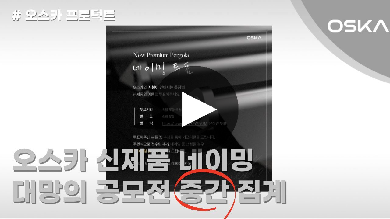 안녕하세요. 오스카입니다. 다가오는 목요일부터 참가하는 수원 경향하우징페어 준비로 정신이 없는 오늘인데요. 이번 박람회에는 오스카의 전 제품을 선보일 예정이랍니다. 아무튼, 5월 5일에 오픈한 지붕이 걷어지는 특징의 파고라 티저 영상은 다들 보셨나요? 먼저 티저를 못 보신 고객님들을 위해 다시 한번 티저부터 보고 오늘의 오스카 뉴스레터를 시작해 볼까 합니다 :-)