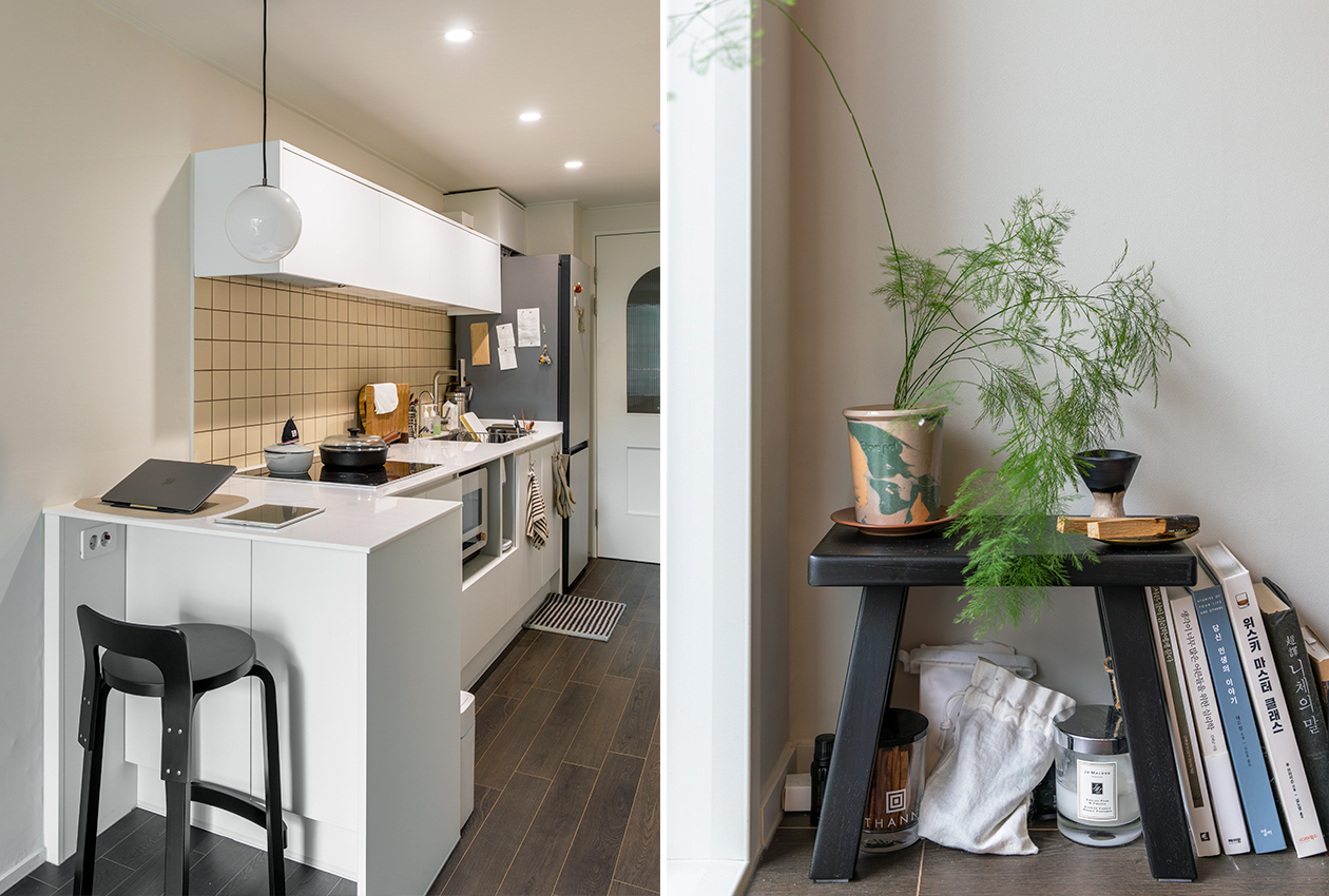 🖌️ 이 집에 살게 되면서 달라진 생활 패턴이 있다면요?👩🏻 완전히 집순이가 되었어요. 예전에는 집보다 밖에서 시간을 보내는 걸 더 좋아했어요. 그래서 오히려 집에는 일부러 불편한 요소를 두기도 했죠. 예를 들어 소파를 아예 두지 않거나, 편안함보다 예쁜 디자인을 우선으로 선택하는 식이었어요. 그런데 지금은 집에서 보내는 시간 자체가 기쁨이에요. 불편함을 일부러 두던 집이 아닌, 머무는 것만으로도 편안하고 만족스러운 공간이 되면서 자연스럽게 집에 머무는 시간이 많아졌어요. |