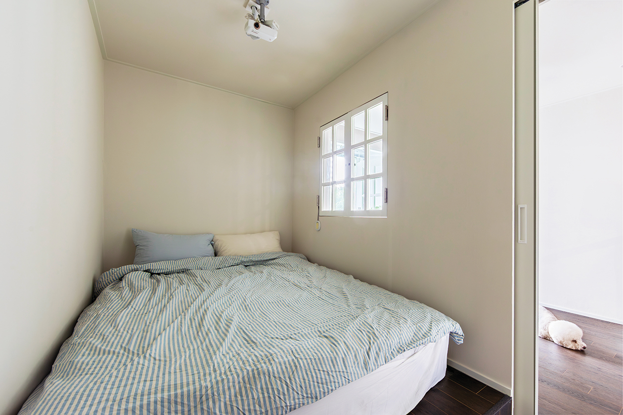 🖌️ 가벽을 활용한 공간 분리가 인상적이에요.👩🏻 올해 초 이사하면서 전체 인테리어를 새로 했어요. 가장 크게 손본 곳은 침실이에요. 기본적으로는 거실 겸 안방으로 사용하는 큰 방 하나였는데, 가벽을 설치하면서 지금처럼 거실 쪽으로 창이 난 구조가 되었죠. 공간을 넓게 터서 쓰기보다는 침실을 따로 분리해 두고 싶었어요. 잠자는 공간을 중요하게 생각하거든요. 거실과 침실이 완전히 나뉘어 있지 않으면 집중이 안 될 것 같더라고요. 그래서 ‘가벽은 꼭 필요하겠다.’ 싶었고, 예전 집에서도 가벽을 활용해 본 경험이 있어서 크게 고민하지 않고 설치하게 됐어요. |