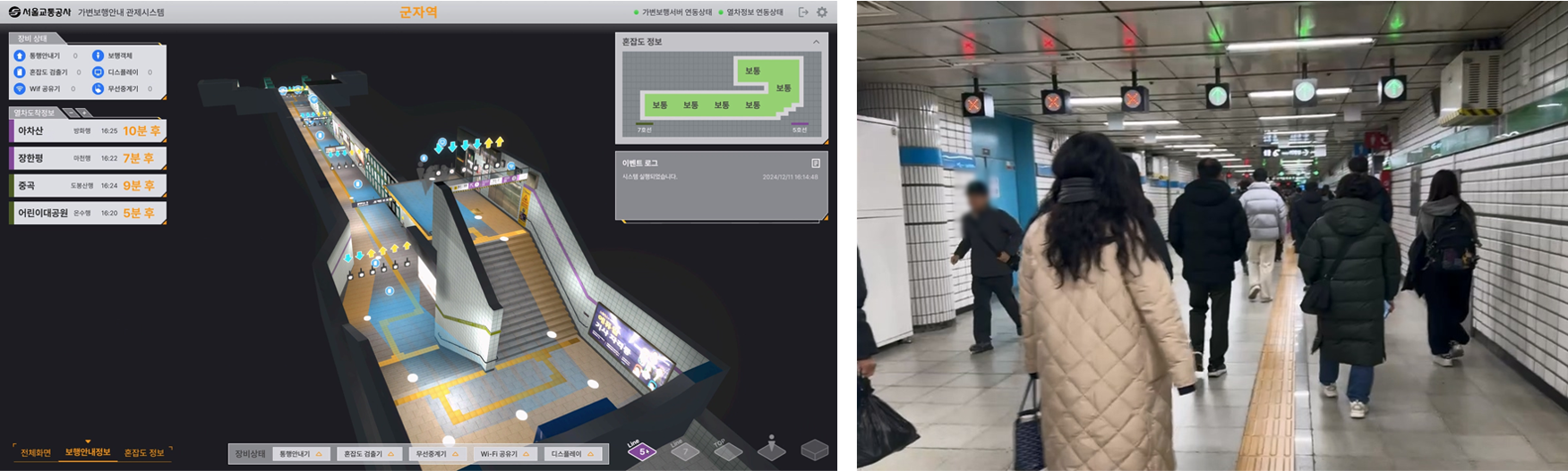 서울경제진흥원의 지원을 받아 서울교통공사 건축처와 함께 군자역과 사당역 환승통로에 시범 적용한 ‘AI 기반 실시간 보행안내 시스템’이 성공 판정을 받으며, 혼잡 시간대 군중 흐름 분산과 시민 안전 확보에 효과가 있음을 입증했습니다.