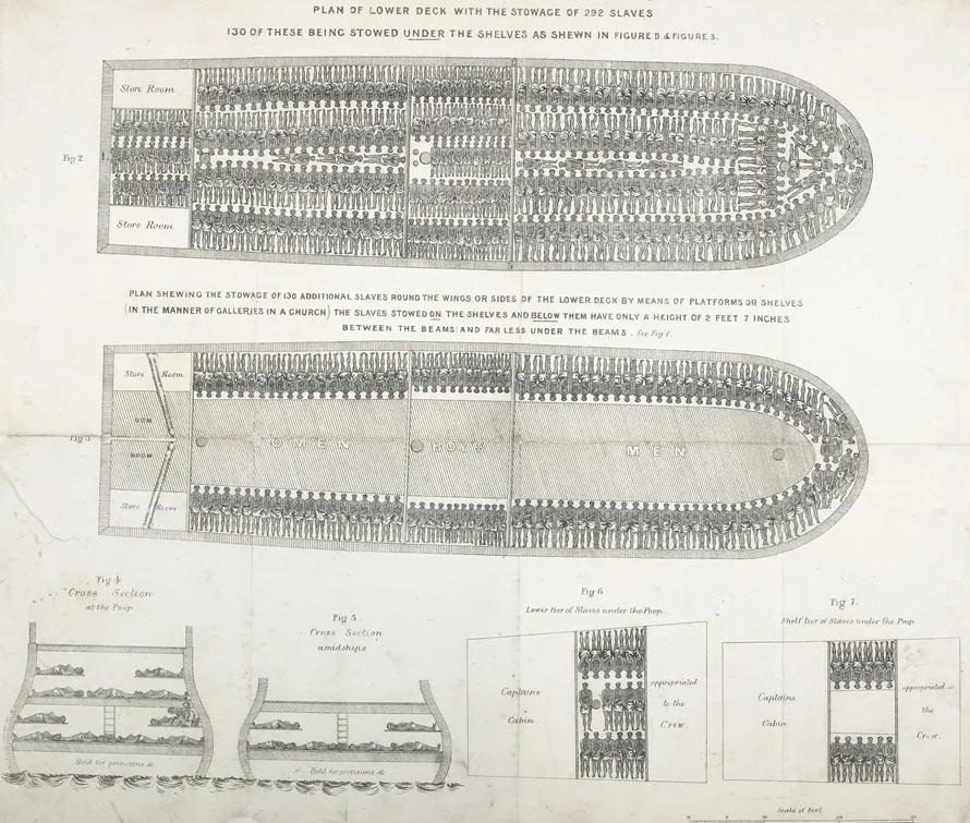 영국의 노예선: 18세기 후반 영국 리버풀 상인들이 사용한 대서양 삼각무역용 노예선인 브룩스호. 당시 정치인 윌리엄 윌버포스가 노예선의 잔인함을 호소하며 노예무역폐지법을 주장했다. 영국은 1833년 노예제가 폐지된다. 선창은 482명을 수용하도록 설계됐지만, 배에는 최대 609명의 노예가 실리기도 했다.