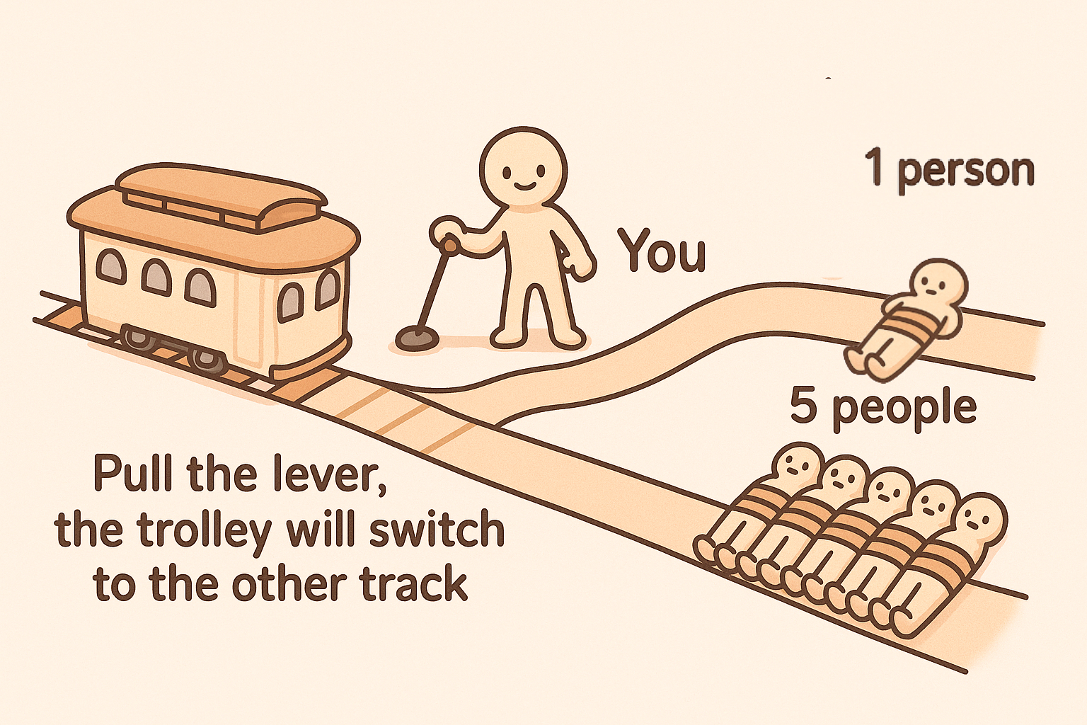 “브레이크가 고장 난 기차가 분기점 앞에 있는 선로 위를 달려오고 있다. 오른쪽 선로에는 다섯 명이 작업 중이고, 왼쪽 선로에는 한 명이 있다. 선로를 그대로 두면 5명이 죽지만, 당신이 만약 스위치를 바꾸면 한 명만 죽는다. 당신은 스위치를 당길 것인가?”