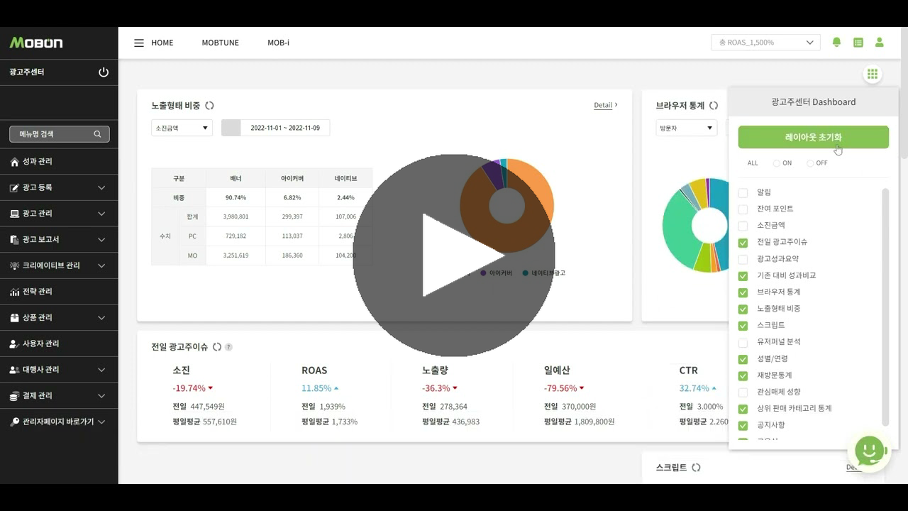 사용자 인터페이스(UI).사용자 경험(UX) 향상을 통해 우리 모비온 사용자의 편의성을 높였습니다. 플랫폼 대시보드가 전면 개편되었는데요! 심플하고 직관적인 대시보드 디자인과 사용자 친화적인 메뉴 구성 등으로 마케터들의 업무 효율 향상까지 도와 드립니다. 변경된 대시보드를 통해 캠페인 별 KPI 달성률, 광고 성과 비교 및 요약, 계정 이슈, 모비온 CDP에 축적된 유저 퍼널 데이터 등을 표와 그래프로 한눈에 확인 할 수 있습니다. 핵심은 이 지표 중에 '내가 지금 보고 싶은 지표' 위젯만 꺼내어 대시보드를 구성할 수 있다는 것이죠! 이것 저것 다 볼 필요 있나요? 이제 성과 대시보드까지도 개인화 맞춤으로 제공하는 모비온🤘 |