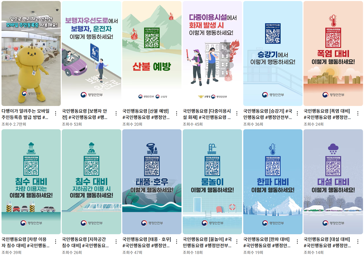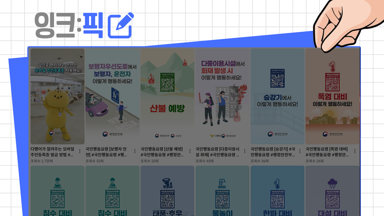 영상 목록을 보면, 갑자기 재난 발생 시 대국민행동요령 정보를 전달하는 쇼츠영상을 연달아 올린 것을 확인할 수 있었습니다. 재난에 빠르게 대응할 수 있도록 정보를 전달하는 건 행정안전부의 중요한 역할입니다. 그렇기에 부처명에도 '안전'이 포함되어 있는 것이기도 하고요.