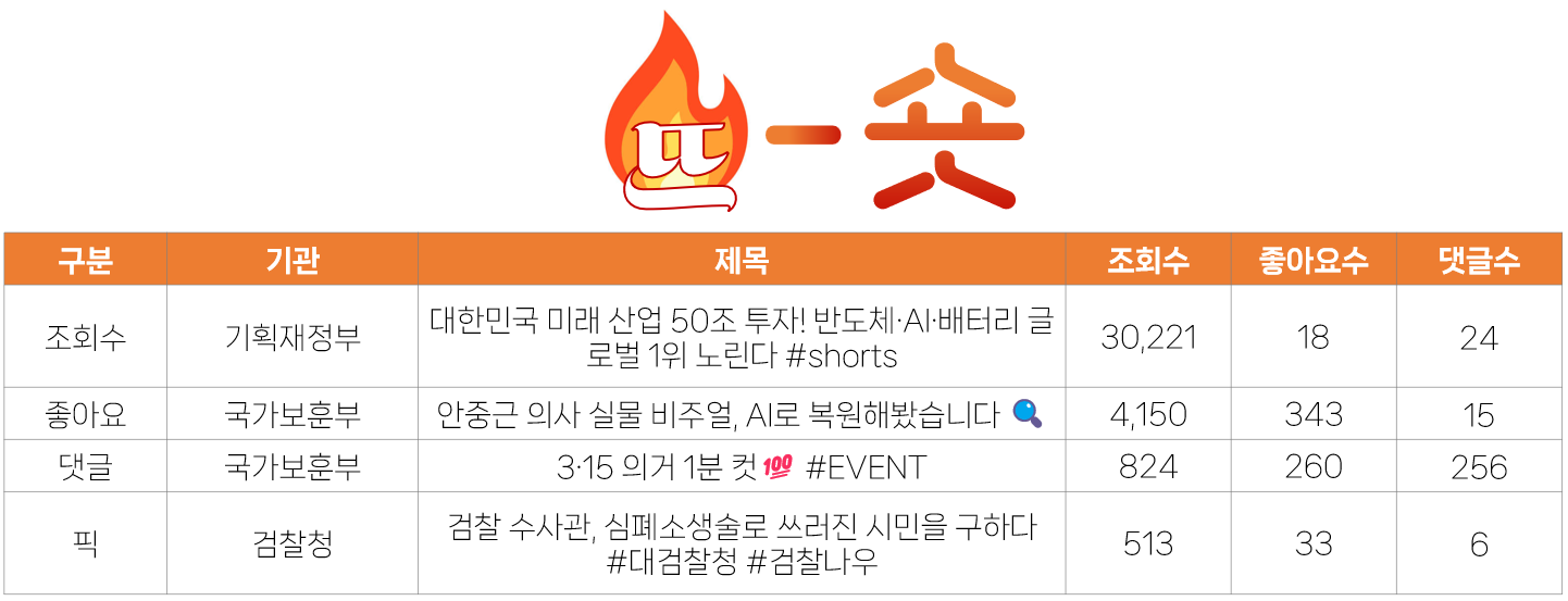 🛒잉크픽 ㅣ 행정안전부가 왜 그럴까? 🔥뜨숏 ㅣ 검찰청이 경찰청 영상에서 배워야 할 것은? 🪩종합 ㅣ 일반영상 수치 감소가 전 주 대비 크게 감소한 이유는? 📊상세 분석 ㅣ 쇼츠영상 전성시대...라고 말할 수 있을까? |