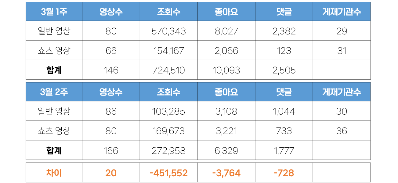- 상세히 살펴보면 일반영상과 쇼츠영상의 수량 모두 상승했으며, 특히 쇼츠영상의 영상 수가 크게 증가했습니다. 조회수 부분에서는 일반영상의 조회수가 약 47만회 감소한 것을 확인할 수 있었습니다. 이는 지난 주 교육부 장관이 출연하는 시리즈 영상 2건에 과도하게 영상 조회수가 몰렸기 때문으로 분석할 수 있습니다. 마찬가지로 해당 영상에 이벤트 진행의 영향으로 이번 주 좋아요와 댓글 수 모두 감소했습니다. 쇼츠영상은 지난 주 대비 14건 증가한 반면, 조회수는 약 1.5만회 상승, 좋아요와 댓글 수치는 크게 증가했습니다.
