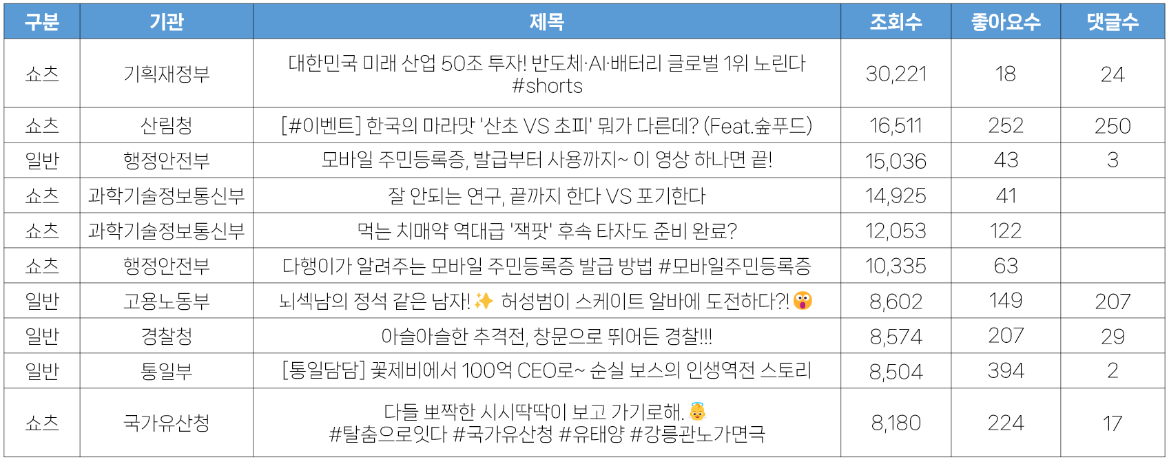 - 2025년 3월 2주 중앙행정기관 유튜브 채널에 게재된 영상의 조회수 분석 결과, 기획재정부 <대한민국 미래 산업 50조 투자! 반도체·AI·배터리 글로벌 1위 노린다 #shorts> 영상이 수집일 기준 3만 여 회 이상을 기록하며 가장 많은 조회수를 보여주었습니다. 쇼츠영상이 조회수 1위에 오른 것은 매우 드믄 일로, 기획재정부에서 이 영상에 신경을 많이 썼음을 확인할 수 있습니다. 온라인대변이 직접 등장해 정책 관련 내용을 소개하는 구성으로, 현재 중앙행정기관 유튜브 채널에 올라오는 쇼츠영상 중에서 단연 최고의 영상 퀄리티를 보여주고 있다는 점도 눈에 띕니다.