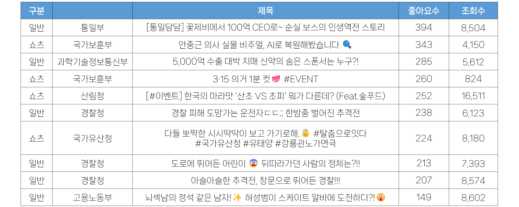 - 3월 2주 가장 많은 좋아요를 확보한 영상은 통일부 <[통일담담] 꽃제비에서 100억 CEO로~ 순실 보스의 인생역전 스토리>로, 수집일 기준 394개를 기록했습니다. 뒤를 이어 국가보훈부의 쇼츠영상도 300개 이상의 좋아요를 기록했습니다.