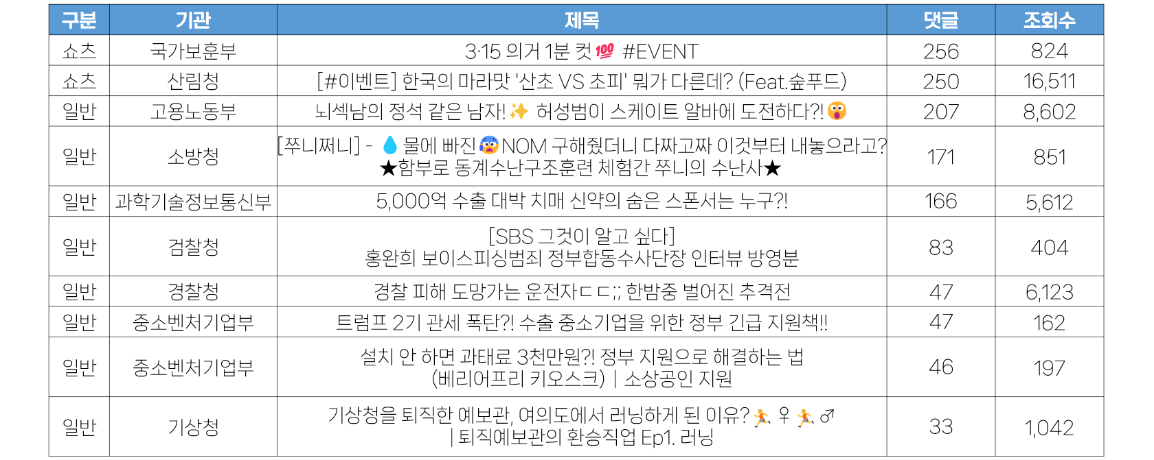 - 댓글 역시 국가보훈부 영상이 가장 많은 수치를 확보했습니다. 조회수는 낮지만 이벤트의 영향으로 댓글이 많이 달렸습니다. 다만, 쇼츠영상의 특성상 이벤트를 진행해도 댓글 수가 많지 않았는데, 이번 국가보혼부의 영상만큼은 꽤 많은 댓글 수를 기록하고 있는 중입니다.