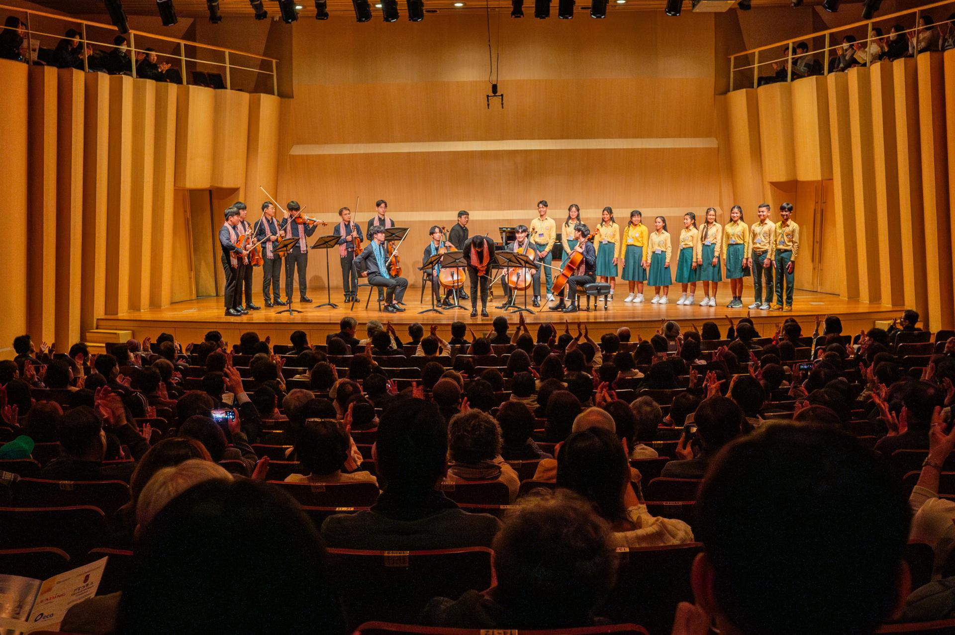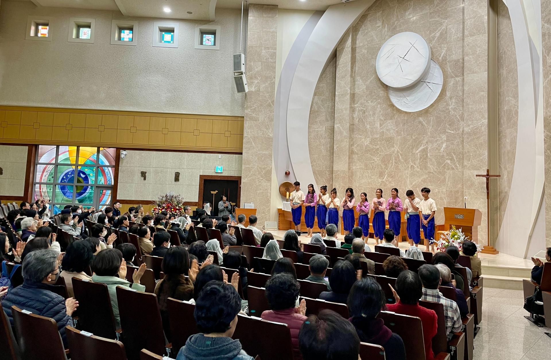 노랑과 초록으로 단복을 맞춘 캄보디아 하비에르 예수회 학교 합창단은 한국에서 많은 것을 구경하고, 배우고 싶어 높은 경쟁률의 면접 및 에세이 과정을 거쳐 선발된 학생들이었습니다. 가진 것이 많든, 적든 함께 나누는 미래를 그리는 마음을 담아 성가 ‘Ubi Caritas’ (사랑의 나눔)와 크메르어로 개사한 마이클 잭슨의 ‘We are the World’를 노래했습니다. 서로의 손을 꼭 부여잡고 평화와 미래를 노래하는 합창단의 모습이 큰 울림을 주었습니다.