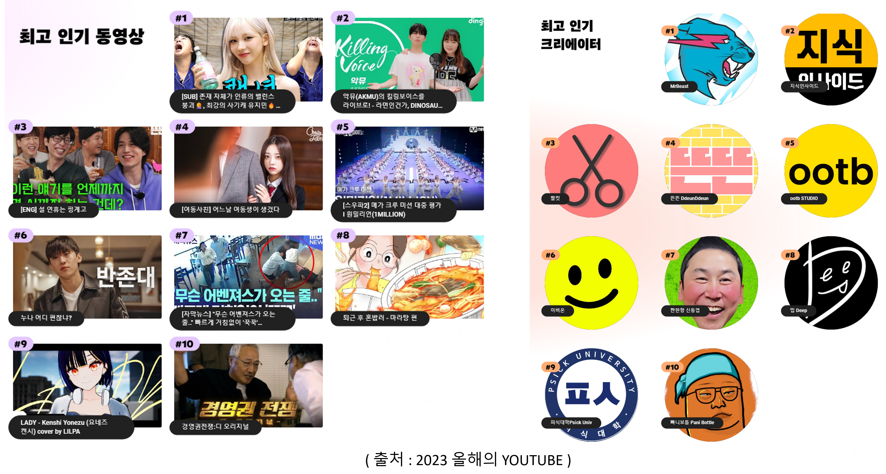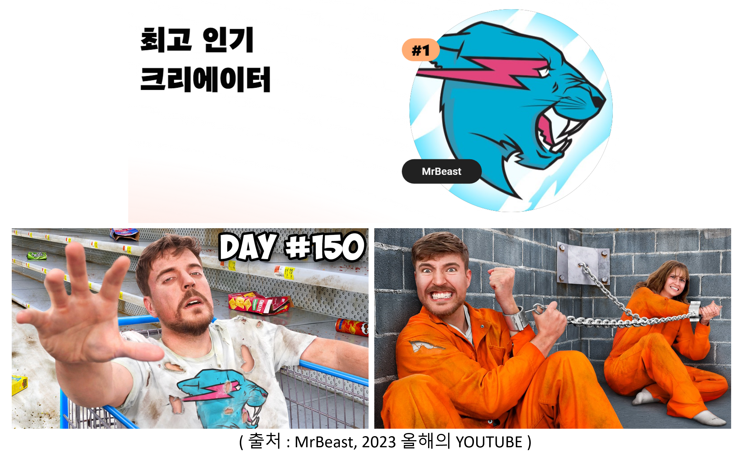 λλ€. MrBeast μ±λμ νκ΅ μ±μ°λ₯Ό ν΅ν΄, μΈμ΄ νμ₯μ ν΄μ, λνλ―Όκ΅ -μ¬ν΄μ μ νλΈ 2023μμ 'μ¬ν΄ μ΅κ³ μΈκΈ° ν¬λ¦¬μμ΄ν°' 1μμ μ μ λμμ£ . νκ΅μΈλ°, μΈκ΅μΈ ν¬λ¦¬μμ΄ν° μ±λμ΄ 1μλ₯Ό ν κ²μ μ΄λ‘μ μΈ μΌμ΄κΈ΄ ν©λλ€. κ·Έλ§νΌ νμκ° μΌλ€λ λ»μΈλ°, MrBeastλ λ―Έκ΅μμλ§ 1μκ° μλλλ€. μ€μ€νΈλ μΌλ¦¬μ, λΈλΌμ§, μΊλλ€, λ