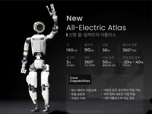- 아틀라스 CES 소개 영상을 보면, 누워 있던 몸을 요가 자세로 일으켜 걸어 나와. 목, 몸통, 다리 관절이 모두 360도 회전하고, 머리에 달린 눈으로 360도 볼 수 있어. 새로운 일이 주어져도 학습할 수 있고, 이 학습한 것은 모든 아틀라스가 공유해. 스스로 직접 배터리를 충전해. 자연어💡를 사용할 수 있으므로 사람들과 어울려 일해.