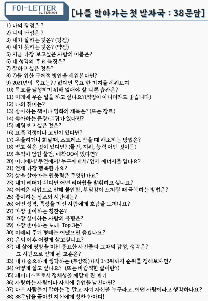 여는 글 editor. 새벽 구독자 여러분, 안녕하세요! 에디터 새벽입니다. 열흘 간 잘 지내셨나요? 저희는 예상보다 많은 분들께서 F01_Letter를 구독해주신 덕에 기쁜 마음으로 다음 회차들을 꾸려가는 중입니다.