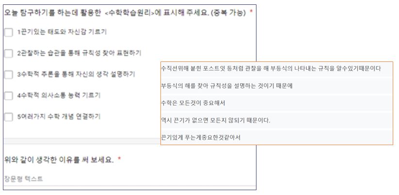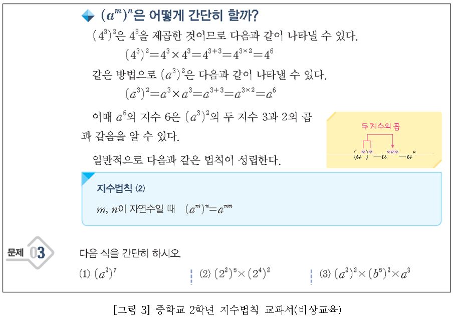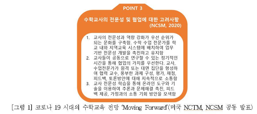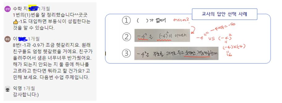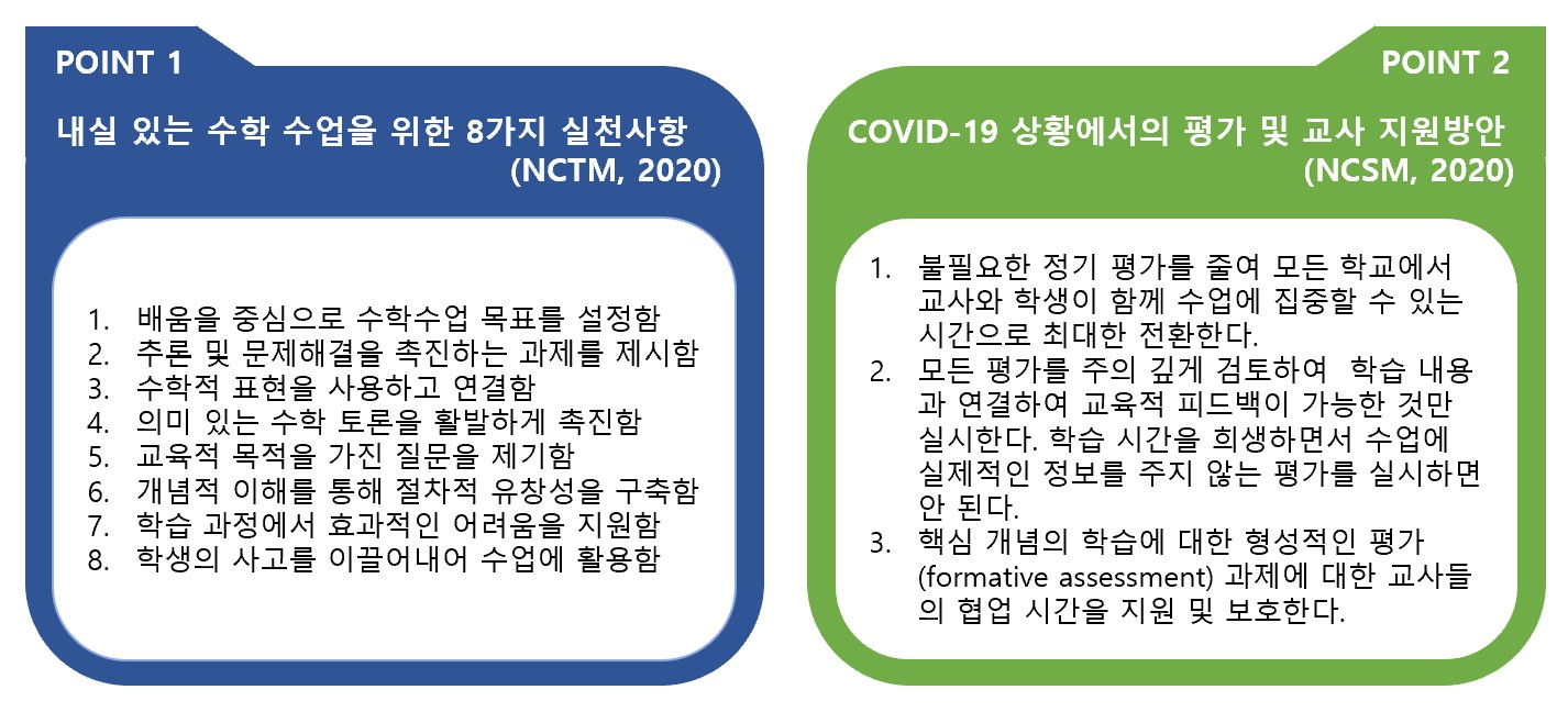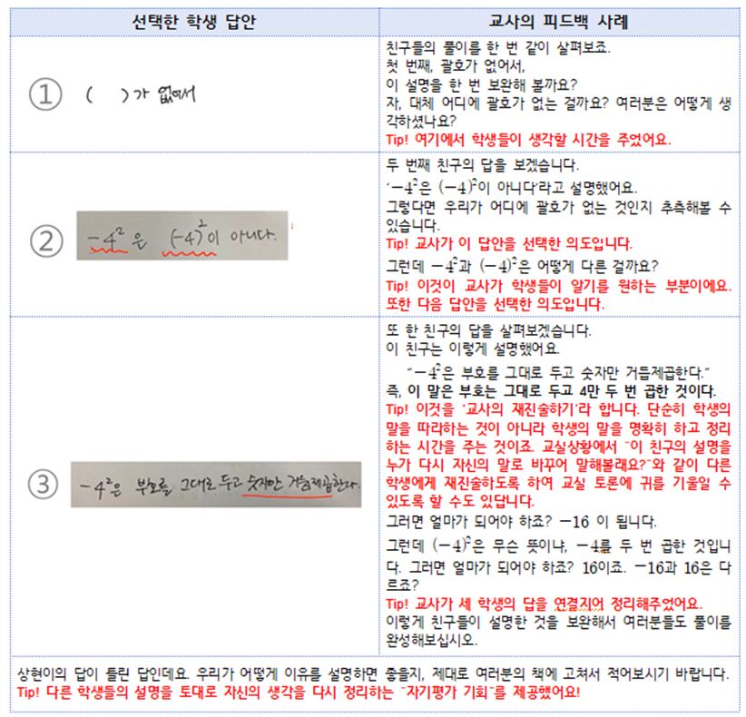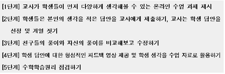∎ 어떤 상황이든 수학 수업에서 가장 중요한 것은 ▲ 철저한 수업계획, ▲ 풍부한 수학 과제의 개발 및 제공, ▲ 학생들의 인지적・사회적 참여, ▲ 학생들의 성장을 돕는 형성적인 평가(formative assessment)이고, 이를 위한 수학 교사의 학습공동체 활동이 필요함. 어떤 수업 상황에서든 수학 수업이 모든 학생에게 의미 있는 배움을 제공하는 방법은 무엇일까요? COVID-19 상황 속에서 더 활발한 논의를 진행 중인 수학교사들의 전문적 학습공동체, <수학의 발견> 세미나팀(학습공동체)의 수업 연구 및 사례를 살펴보고 그 대안을 제시해보고자 합니다. <수학의 발견> 교사 학습공동체는 함께 수업에 대한 공부를 하면서 수업의 4가지 핵심 수업 요소를 만들었습니다. 4가지 핵심 수업 요소는 ▲ 수학 교사의 철저한 수업 계획, ▲ 서로의 생각과 실수를 존중하는 수업 문화 형성, ▲ 토론이 가능한 풍부한 수학 과제의 제시, ▲ 형성적인 피드백(formative feedback)입니다. 이것은 위에서 살펴본 NCTM과 NCSM의 공동 문서 ‘Moving Forward(2020)’에 제안된 강조점들과 같은 맥락을 가지고 있습니다. ▲ 수학 교사들의 철저한 사전 수업 계획 대면(in-person), 원격(remote), 그리고 혼합(hybrid) 수업, 어떤 수업에서든 수학 교사는 수업에 대한 계획이 필요합니다. 특히 지금처럼 혼란스러운 시기에 교사의 수업 준비는 도전과제이지만, 그럼에도 불구하고 중요합니다. 이럴 때, 교사들은 고립되기보다는 동료 교사들과 협력할 필요가 있습니다. 동교과, 동학년 교사들뿐 아니라 전체 수학교사들이 협력하여 수업을 계획하고 실천하고, 이를 성찰해야 할 중요한 시기입니다. 그렇다면 무엇을 계획해야 할까요? 바로 지금 학생들이 꼭 배워야 할 수학 개념이 무엇인가, 그리고 이 개념을 배우기 위한 사전 지식이 무엇인가, 사전 지식과 배워야 할 수학 개념을 잘 연결시켜 줄 좋은 수학 과제는 무엇인가, 학생들의 답변에 대한 형성적인 피드백은 무엇인가 등등이 미리 계획되어 있어야 합니다. 또한 이런 것들이 온라인, 오프라인 환경 속에서 각각 동시에 구현할 방안도 계획해야 합니다. 이런 것들은 혼자서 할 수 없습니다. 동료 수학 교사들과 같이 학습공동체를 이루어 해결해 나가야 합니다. ▲ 모든 학생들의 수학적 아이디어와 실수를 존중하는 수업 문화 형성 온라인 수학 수업에서도 협력하는 수업 문화를 세우는 것에 소홀하면 안 됩니다. 직접 교실에서 만나는 것도 아니고 온라인 수업에서 문화가 왜 필요한지 의문이 들 수도 있습니다. 그러나 교실이든, 온라인이든 수학 교사가 어떤 것을 강조하고 있는지에 따라 학생들의 생각과 태도가 달라질 수 있습니다. 만약 교사가 온라인 수학 수업을 하면서 “이것은 시험에 꼭 나오니까 잘 외워두자. 양수의 제곱근은 두 개인데 학생들이 헷갈려하니까 선생님들이 평가에 꼭 낸다.”와 같이 암기와 평가만을 강조한다면 학생들은 수학은 어려운 문제를 푸는 힘든 교과, 좋은 점수를 받기 위해 외워야 하는 교과라고 생각할 것입니다. 다음 수업 사례는 대안 교과서 <수학의 발견> 세미나팀에서 수업에 대해 같이 고민한 후, 공동으로 구안한 온라인 수학 수업을 실천한 교사의 수업 장면입니다. ▲ 수학적 토론이 가능한 풍부한 수학 과제의 개발 및 제시 문제 풀이만 단순히 요구하는 것은 온라인 수학 수업을 위한 좋은 과제가 아닙니다. 수학 수업을 하는 가장 큰 이유는 참여한 학생들이 수학 개념을 충분히 이해하게 하는 것입니다. ‘이차함수를 안다’는 것은 이차함수의 식을 변형하는 절차, 근의 공식 등을 외워 문제를 풀 수 있다는 것을 의미하는 것이 아닙니다. 수학 개념을 안다는 것은 그 개념을 이해한다는 것입니다. 또한 이전에 배운 개념과 연결 지어 설명할 수 있어야 ‘정말 그 개념을 이해했구나!’라고 판단할 수 있습니다. 그러므로 수학 수업에서 학생들이 수학을 진정으로 알도록 안내할 수학 과제는 선택이 아닌 필수입니다. 보통 학교에서 사용하는 교과서에 제시되는 중학교 2학년 지수법칙에 대한 수학 과제는 다음과 같습니다. 온라인 수학 수업에서 위와 같은 과제는 단순히 교사의 설명식 수업 영상을 보거나, 실시간 쌍방향 온라인 수업을 하더라도 교사의 설명 동영상을 보는 것과 큰 차이가 없을 것입니다. 이러한 영상 시청이 수학적 사고를 도울 수 있을까요? 대안 교과서 <수학의 발견>에서는 이 장면을 다른 과제 형태로 제시하고 있습니다. 먼저 학생들이 이유를 찾아보고, 자신의 법칙을 설명할 기회를 제공합니다. 온라인 수학 수업에서 학생들이 다양하게 생각해보고 자신의 아이디어를 기록할 수 있다면, 그 다음은 일방적인 전달이 아닌 학생들의 아이디어에 대한 교사의 피드백으로 온라인 수업의 방향이 달라집니다. ▲ 형성적인 피드백(formative assessment)의 제공 학생들은 왜 평가받아야 하는 것일까요? 스탠포드 대학의 Boaler 교수는 50점을 받은 학생은 자신을 50점짜리, 80점을 받은 학생은 자신을 80점짜리 학생이라 생각한다고 하며, 점수와 학생을 동일시하는 평가 문화를 비판했습니다. 우리는 학생들이 왜 평가를 받아야 하는지, 평가에서 학생들에게 점수