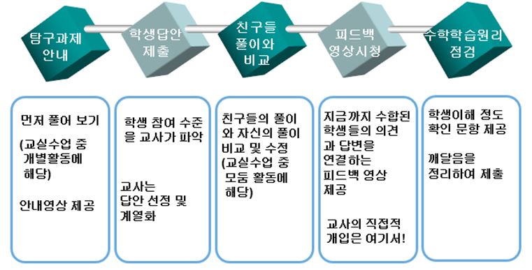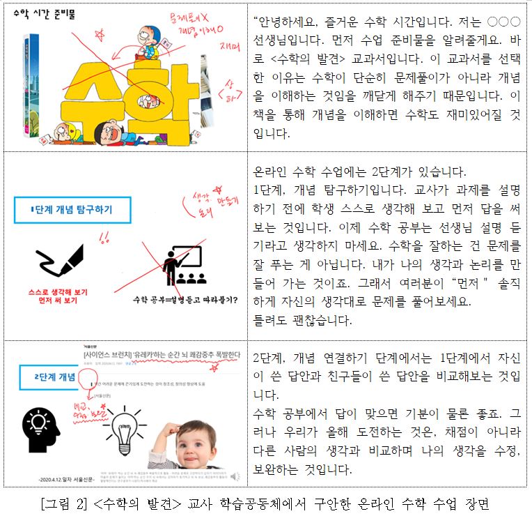■ 코로나19 사태 이후의 수학 수업과 평가 내실화 촉구 보도자료(2020. 7. 9.) 온라인 시대에 확대되는 교육격차 해소를 위해 수학 수업과 평가 내실화 논의를 시작해야 합니다. ▲ COVID-19로 인해 생긴 교육적 불평등과 학업 격차를 해소하고 앞으로 수학교육이 나아 갈 방향에 대하여 교육부, 각 교육단체, 수학교육 전문가, 교수, 교사 등이 공동으로 대화를 시작해야 함. ▲ 에듀테크의 도구적・기술적 측면을 넘어서 학생들의 배움에 초점을 둔 효과적인 온라인 수학 수업 및 평가에 대한 대안을 중심으로 논의가 이루어져야 함. ▲ 어떤 상황이든 수학 수업에서 가장 중요한 것은 △ 철저한 수업계획, △ 풍부한 수학 과제의 개발 및 제공, △ 학생들의 인지적・사회적 참여, △ 학생들의 성장을 돕는 형성적인 평가(formative assessment)이고, 이를 위한 수학 교사의 학습공동체 활동이 필요함. ▲ 중학교 대안 교과서 <수학의 발견> 학습공동체의 온라인 수업은 5단계로 구성됨. ▲ 불확실한 시대에 수학 교사가 협력하여 보다 좋은 수학 수업을 구상하고 실천할 수 있도록 국가는 수학 교사들의 공동체 문화 형성과 충분한 연구 시간을 확보할 수 있는 현실적인 방안을 적극적으로 강구해야 함. COVID-19 사태는 이제 변수가 아닌 상수가 되었습니다. 각국의 수학교육 연구기관은 COVID-19 팬데믹으로 발생된 수학교육의 여러 가지 문제점을 확인하고 다음 단계로의 교육적 대안을 모색하고 있습니다. 모든 것이 불확실하고 학교 교육의 정상화만 기다리고 있을 수 없는 이 시점에, 수학교육은 무엇을 향해 나아가야 할까요? 대규모의 수학교육전문가와 교사들로 구성된 영향력 있는 미국의 수학교육단체 NCSM(National Council of Supervisors of Mathematics)과 NCTM(National Council of Teachers of Mathematics)이 모여 COVID-19 이후 수학교육이 나아가야할 방향에 대해 공동의 대안 ‘Moving Forward’를 발표한 것은 우리에게 시사하는 바가 큽니다. 우리는 아직도 에듀테크 기술의 현란함에 매몰되어 단편적인 측면만 바라보고 있는 실정이며, 수학교육에서 가장 중요한 수학 수업과 평가에 대한 공동의 협력적 대화가 활발하게 이루어지고 있는지 의문입니다. ∎ 에듀테크의 도구적・기술적 측면을 넘어서 불확실한 시대 속에서 수학에서 특히 심각해지는 교육적 불평등과 학업격차를 해소하기 위해 학생들의 배움에 초점을 둔 효과적인 수학 수업 및 평가에 대한 대안을 중심으로 논의가 이루어져야 함. 교육부는 지난 5월 27일 ‘제3차 수학교육 종합계획(2020-2024)’을 통해 지능정보사회의 소양을 갖추고 세계를 선도하는 인재양성이라는 비전을 발표했습니다. 2020년, 4월 초부터 COVID-19로 급격하게 도입된 에듀테크 기술이 교육계에서 생각했던 것보다 눈부신 발전을 했다는 사실에 놀랐기 때문일까요? 이 문서에는 수포자가 없는 수학교실에 대한 대안으로 인공지능(AI)를 활용한 수학 학습 지원 시스템을 구축, AR, VR을 활용한 다감각적 수학 콘텐츠 개발, 원리를 탐구하고 생각하는 힘을 기르기 위해 인공지능 수학 등 실생활 기반 과목 개발, AI 평가 지원 시스템 개발 등과 같이 첨단 기술 활용을 미래 교육에 본격적으로 도입하려는 정책이 주를 이룹니다. 코로나 시대에 정작 필요한 정규 수학 수업의 내실화를 위한 정책은 거의 없는 상태여서 매일의 수업에 대한 모든 책임을 현장 교사에게 부담지우고 있습니다. Post COVID-19, 앞으로 수학교육이 어디로 가야 하는가에 대한 전망은 최근 미국의 수학교육 리더십 조직인 NCSM과 수학교사협의회 NCTM이 공동으로 발표한 ‘Moving Forward : Mathematics learning in the Era of COVID-19’에서도 확인할 수 있습니다. 이 계획에서는 앞으로 언제든 다시 실시될 수 있는 세 가지 유형의 수업, 즉 대면(in-person) 수업, 원격(remote) 수업, 그리고 혼합(hybrid) 수업 상황에 대한 대책을 말하고 있는데, 우리나라의 제3차 수학교육 종합계획의 관점은 미국의 Moving Forward와 많은 차이가 있습니다. 제3차 수학교육 종합계획은 에듀테크 기술을 활용한 수업과 그에 대한 교사 전문성 향상 지원이라는 도구적・기술적인 활성화를 강조하였지만, Moving Forward는 갑작스러운 수학 교수・학습의 변화에 따른 구조적인 불평등의 해소를 위해 정규 수업 및 평가가 어떻게 변해야 하는가에 더 중점을 두고 있습니다. 제3차 수학교육 종합계획에는 에듀테크를 활용한 교육 도입의 필요성을 학생들의 수학에 대한 낮은 흥미도와 수학 포기자의 증가, 그리고 기초학력의 저하에서 찾고 있습니다. 또한 미래 교육을 위해서는 지식 암기와 문제 풀이 중심의 학습에서 벗어나 원리를 탐구하고 생각하는 힘을 기르는 교육으로 패러다임이 바뀌어야 한다고 주장하고 있습니다. 하지만 우리나라의 이런 고질적인 수학교육의 문제가 에듀테크 도입으로 해결될 것이라 믿는 사람들은 거의 없을 것입니다. 주입식 수업과 결과 중심의 상대평가가 유발하는 수학에 대한 부정적인 인식은 인공지능 등 첨단 기술이 해결해 줄 수 없습니다. 물론 우리나라의 제3차 수학교육 종합계획에서 강조한 도구적・기술적 대비책도 필요합니다. 그러나 무엇보다 수학 교육에서 중요한 것은