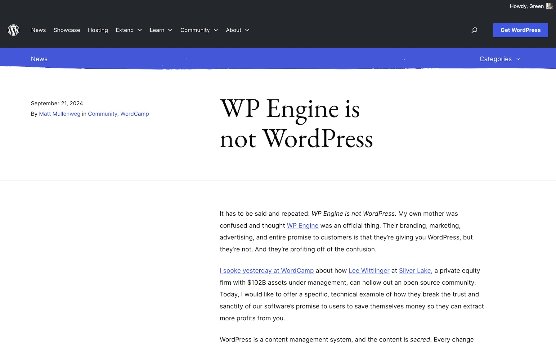 한편에서는 또 다른 대표적인 오프소스 프로젝트 워드프레스와 워드프레스 웹사이트를 위한 관리형 호스팅 서비스 기업 WP엔진이 진흙탕 싸움을 벌이고 있습니다. 2003년 워드프레스를 창립한 맷 뮬렌웨그 (Matt Mullenweg)는 올해 들어 WP엔진과 긴장 관계를 이어왔는데 얼마 전 해당 사태가 수면 위로 떠오른 것입니다.