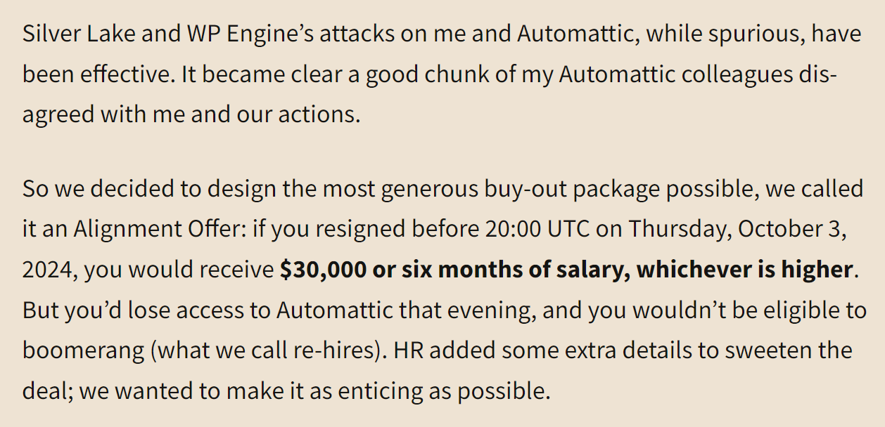 사태는 점입가경으로 치닫고 있습니다. 오토매틱과 WP엔진과의 분쟁이 워드프레스의 오픈소스 철학에 반한다는 직원들의 반발이 이어지자 뮬렌웨그는 자신의 결정에 동의하지 않는 직원들에게 6개월 월급 또는 3만 달러의 퇴직금 중 높은 금액을 받고 당장 퇴사할 수 있는 기회를 준다고 내부 공지를 올린 것입니다. 오토매틱 전체 직원의 8.4%는 패키지를 받고 퇴사를 선택했습니다.