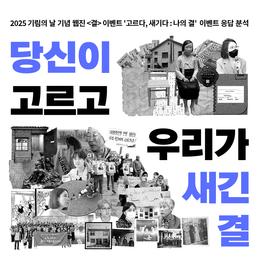 2025 기림의 날을 맞아 웹진 <결>이 2025년 8월 11일부터 31일까지 진행한 독자 이벤트 ‘고르다, 새기다 : 나의 결’에는 무려 887명의 독자가 참여했습니다. 단순히 3편의 콘텐츠를 선정해달라는 요청에 그치지 않고, 선정한 이유까지 밝혀야 하는 이벤트에 이렇게 많은 독자들께서 함께한 고무적인 결과에 웹진 <결>은 다시 한 번 감사 드립니다. 이번 이벤트에서 독자들께 가장 많은 선택을 당한 콘텐츠는 「‘모야모야’에서 ‘연대·실천’으로: 일본 대학생이 성찰한 한일 역사」, 「더 이상 침묵될 수 없는」, 「우리는 서로의 용기, 서로의 증언자」 윤경회 인터뷰 시리즈, 「외국인 지문날인 비판에서 시작된 연대의 지평, 다카지마 다쓰에」, 「실재하는 감각, 삶의 진실 듣기」 등의 순이었습니다. 선정된 기사의 성격은 책과 전시에 대한 리뷰와 인터뷰, ‘위안부’ 연구 등으로 다양하고, 비교적 발행 시기가 가까운 콘텐츠 비중이 높았습니다. 이중 많은 분들이 공감한 10편의 기사 목록과 함께 선정 이유를 정리했습니다.