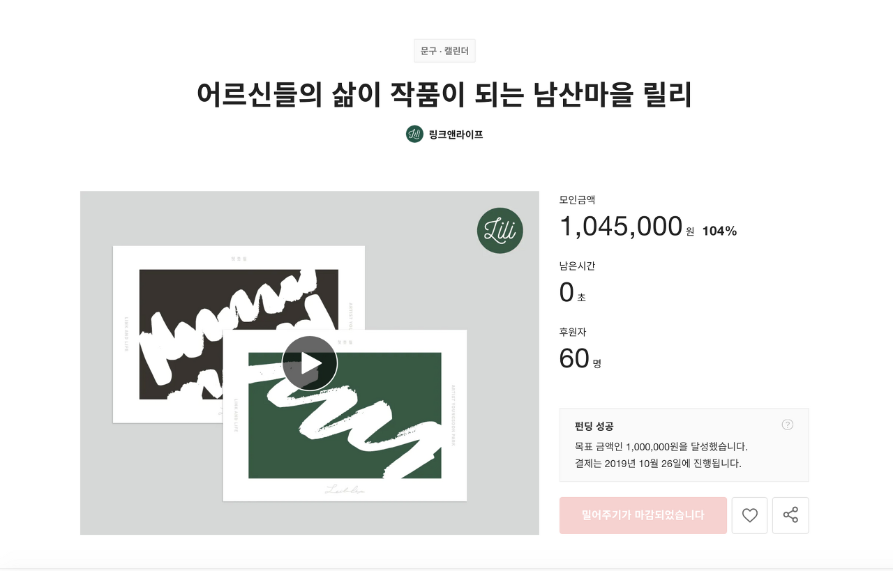 특히 어르신들이 재미있어하셨던 아트웍 프로그램 결과물들을 활용해 페브릭 제품을 만들었는데 비록 목표치는 낮았으나 펀딩에서 100% 이상을 달성하며 본격적으로 브랜드를 시작할 수 있는 용기를 얻었다.*펀딩의 30%는 남산마을 주거취약계층에게 기부했다.