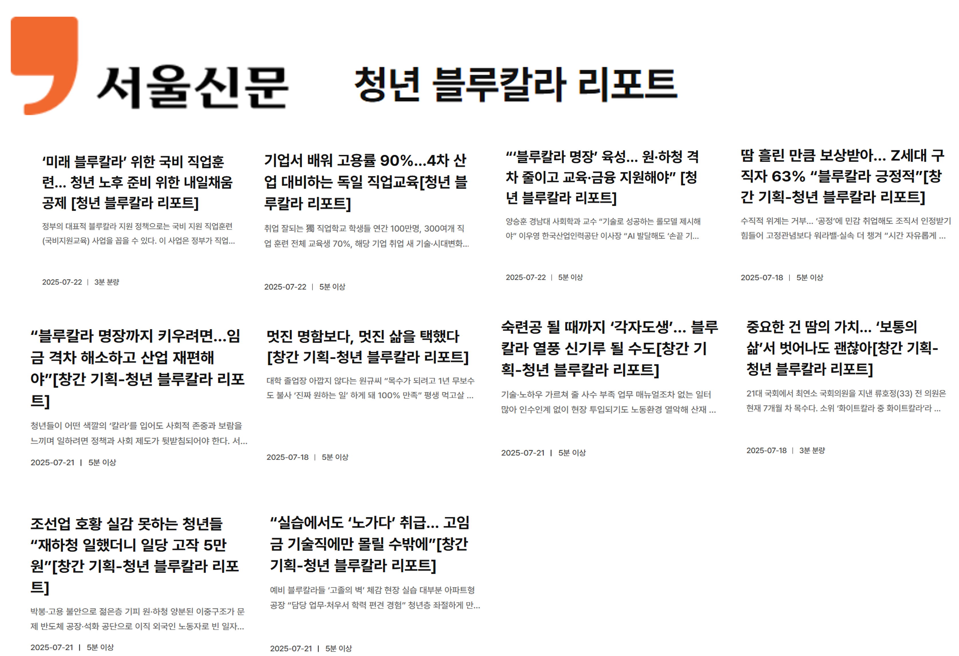 3. 서울신문 기사, <청년 블루칼라 리포트> 총 10개 기획기사 인용, 2025.7.18. ~ 7.21.