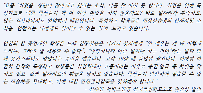 이는 지난 7월 국회에서 열린 ‘청년노동자 증언대회’에서 신수연 서비스연매 전국특성화고 노조 위원장의 발언에서도 드러납니다 (관련보도)⁵. 이런 현실 속에서 현장에서 기술을 습득하여 전문 기능인으로 성장한다는 것은 ‘허상’일 뿐입니다. |