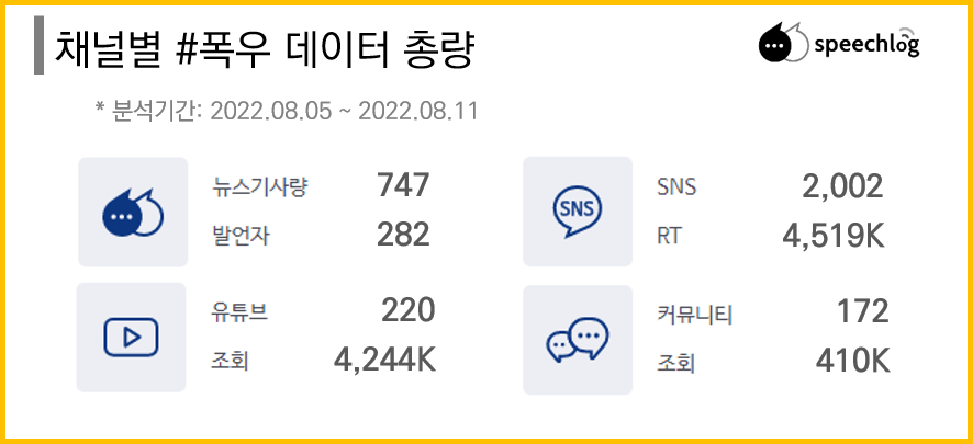 8์ 5์ผ๋ถํฐ 8์ 11์ผ๊น์ง #ํญ์ฐ ํค์๋๋ฅผ ์ด์ฉํ์ฌ ๊ด๋ จ ๋ฐ์ดํฐ ์์ง์, ๊ฐ ๊ธฐ๊ฐ์ ๋ฐ๋ฅธ ์ด ๋ฒ์ฆ๋ ์ถ์ธ๋ ์๋์ ๊ฐ์ต๋๋ค. ๊ธฐ์ฌ์ ๊ฒฝ์ฐ 747๊ฑด์ ๊ธฐ์ฌ์์ ๋ฐ์ธ์ 282๋ช