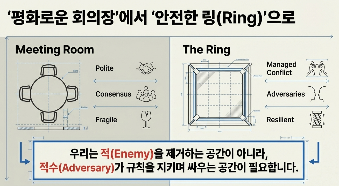 이 실험이 보여준 것은 입장의 차이가 아니라 순서의 힘이었습니다. 우리는 보통 ‘입장 → 충돌 → 단절’의 경로를 밟습니다. 그러나 이 프로젝트는 ‘관계 → 협력 → 충돌 직면 → 선택’이라는 다른 경로를 설계했습니다. 갈등을 없앤 것이 아니라, 갈등을 견딜 수 있는 형식을 먼저 만든 것입니다.