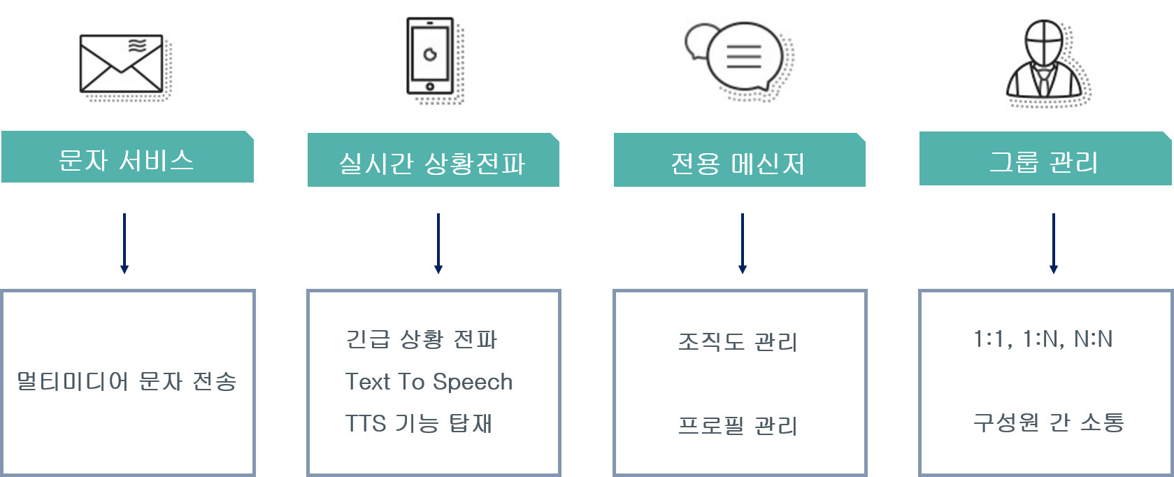 전환하는 등 다양한 QoS(Quality Of Service)를 제공하며 팝업 기능을 통해 하나의 메시지를 문자와, TTS(문자음성자동변환), 진동 알림 벨 등으로 전달 가능합니다.