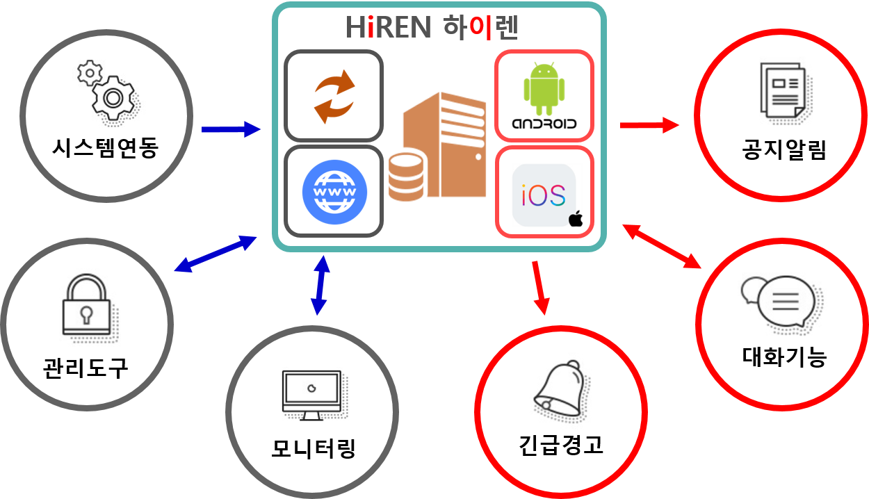 코로나19와 같은 질병재난 발생시 긴급상황메시지 전달이 가능하며 커뮤니케이션 도구로 사용할 수 있는 에이치투오시스템테크놀로지의 고성능 모바일 푸시 솔루션 하이렌(HiREN)을