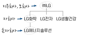 그래서 모회사 중에는 지주회사의 역할을 동시에 하는 경우도 있어요. ㈜LG는 LG화학의 모회사이자 LG그룹의 지주회사입니다 |