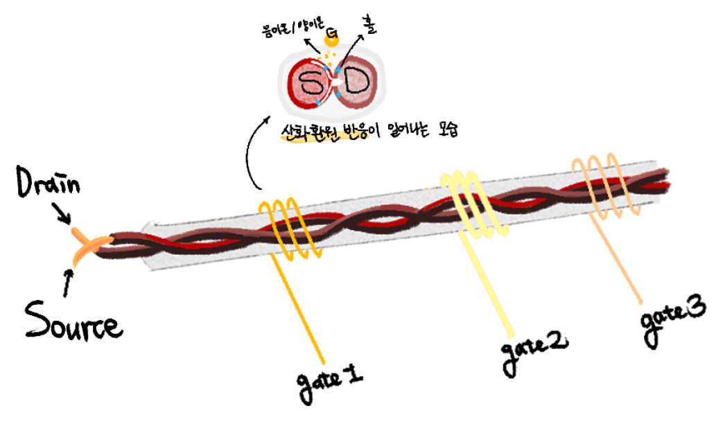 ์ค์์ ์ ๊ธฐ์๊ทน์ ์ํ ์ด์จ ์ด๋์ ํตํด ์ ๋ฌ๋์ฃ . ์ด๋ฅผ ๋ชจ๋ฐฉํ๊ณ ์, ์ฐ๊ตฌํ์ ๊ผฌ์ธ ์ ๊ทน ๊ตฌ์กฐ์ ์ฌ์ ํ ํธ๋์ง์คํฐ์ ์ด์จ-๊ฒ ์ ์ฐ๋ง ๊ฒ์ดํธ๋ฅผ ๋ค์ค์ผ๋ก ๋ฌ์ ์ธ๊ณต์ฌ์ ๋ฅผ ๊ตฌํํ์ต๋๋ค. ํธ๋์ง์คํฐ๊ฐ ๋ด๋ฐ, ๊ฒ์ดํธ๊ฐ ์๋