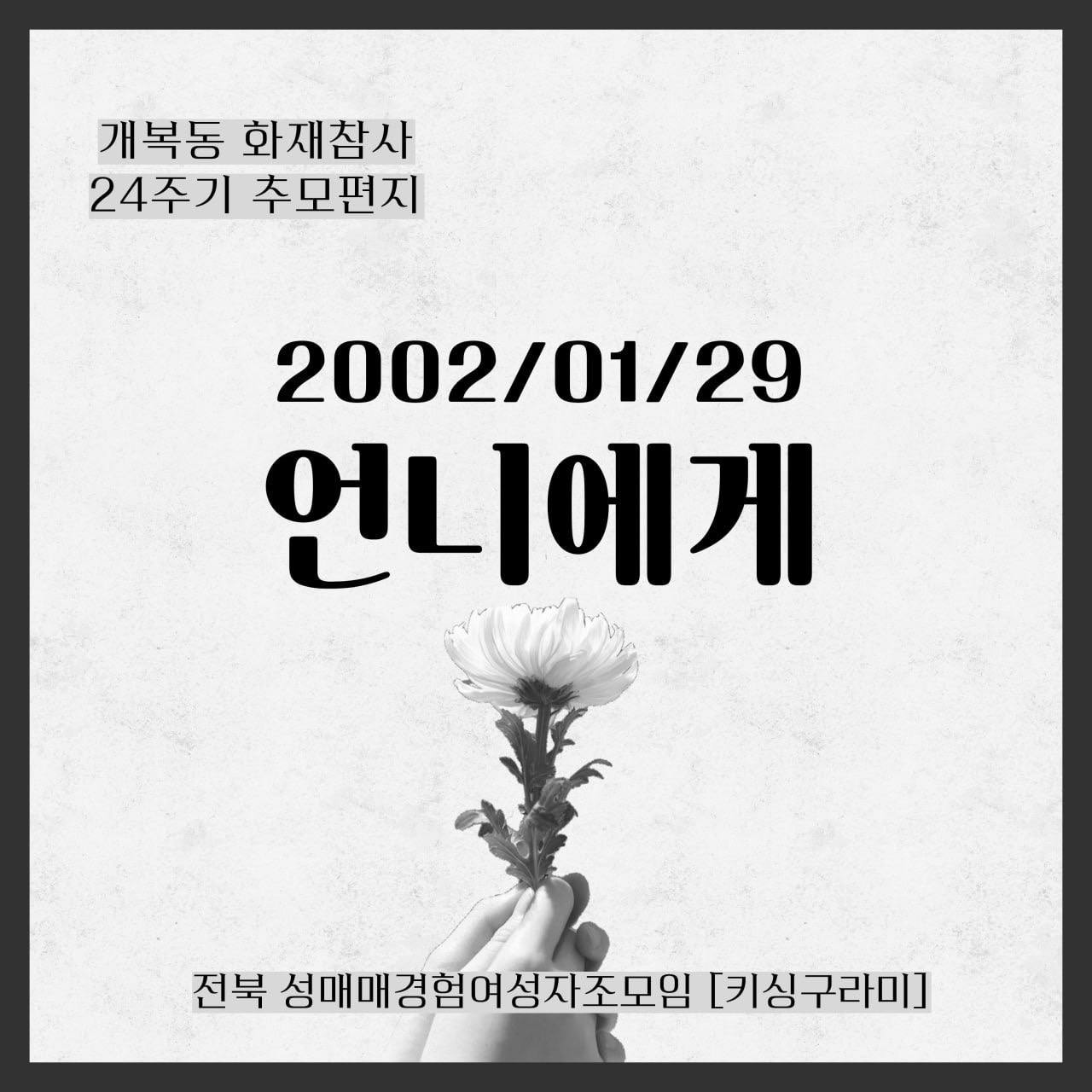 2002년 1월 29일, 군산 개복동에 위치한 유흥주점 ‘대가’에서 발생한 화재로 업소 1층에서 잠을 자고 있던 여성 14명과 감시인이자 관리인이었던 남성 1명이 사망하는 참사가 발생했다. 군산 개복동은 당시 유흥주점이 밀집된 청소년 출입 제한지역, 즉 성매매 집결지였다. 업소에서 불과 50m 거리에 파출소가 있었으나, 경찰은 뇌물을 받고 성매매 영업을 묵인·방조했으며 여성들의 상황을 알면서도 업주를 위해 관리하는 역할을 했다. 소방당국 또한 제대로 된 안전점검을 수행하지 않았다. 명백히 영업장으로 사용되던 건물 2층을 ‘개인주택이므로 점검 대상이 아니다’라고 했던 무책임한 태도는 이후 재판을 통해 그 책임이 확인되었다.