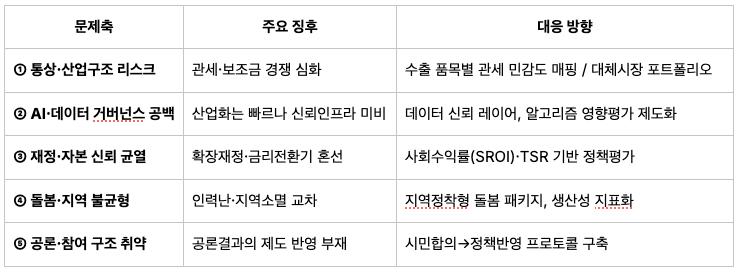 ► 산업·안보·외교 축에서는 833조 투자, 대미투자, 핵잠 논쟁, 샤인 이니셔티브가→ 한국이 어떤 동맹국·해양국·중견국으로 자리 잡을지에 대한 국가 전략 선택을 요구합니다.