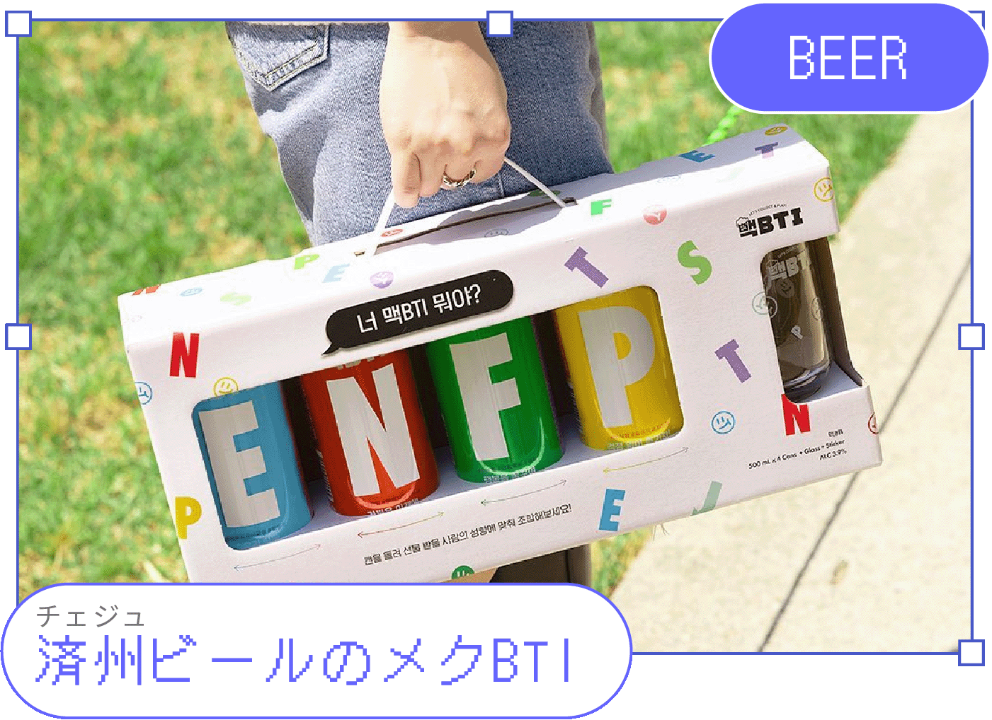 MBTIって知ってる?性格診断テストのMBTIを応用し、EINSFTPJの性格類型がビール缶の表と裏に記されていて4本買うと16種の性格類型を組み合わせることができる。自分のMBTIの組み合わせを見つけるためにコンビニ巡りをする人も多い。🎓