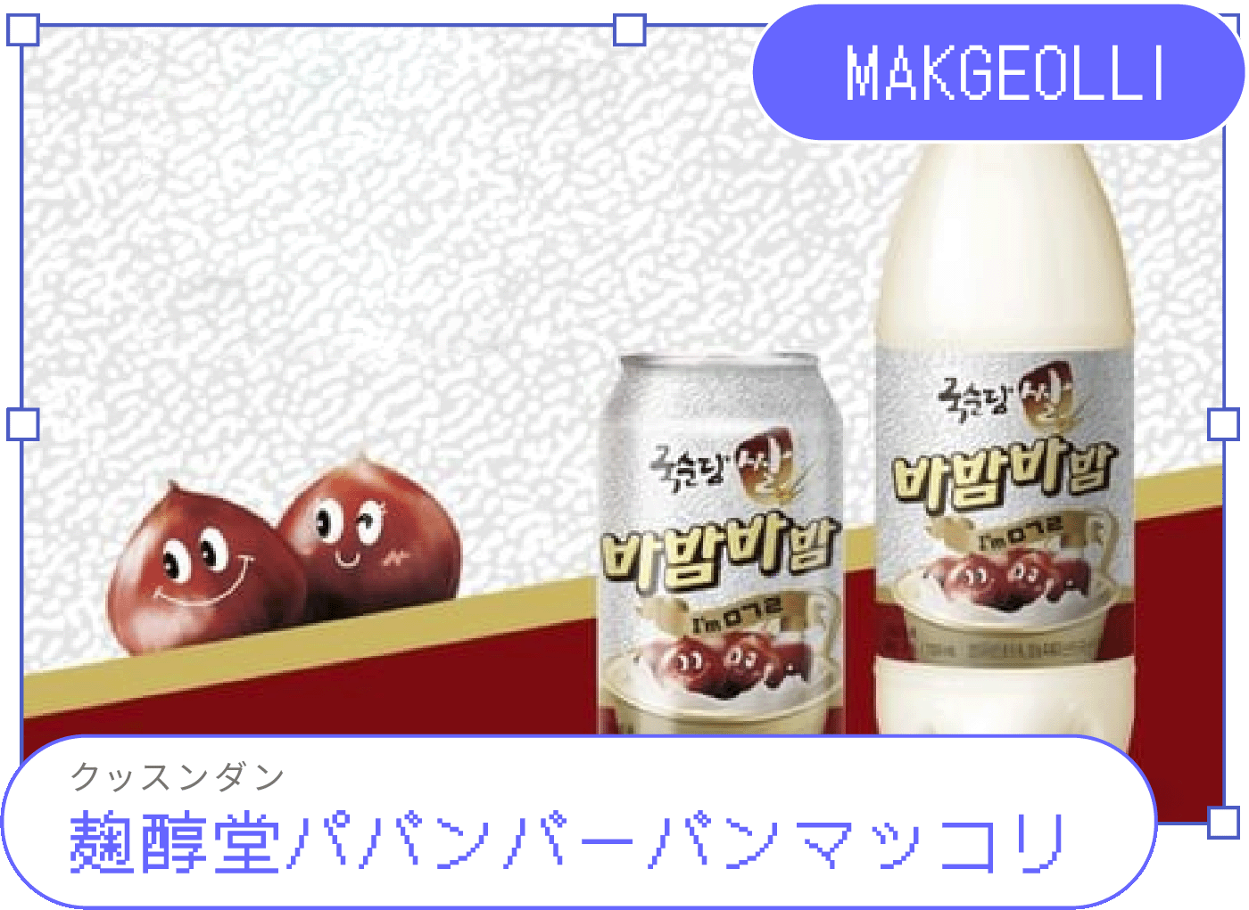 これは絶対飲むべし!栗味のアイス「パバンバー」味のマッコリ。栗🌰の香ばしい甘みが米マッコリのやさしい味に包まれて延々と飲み続けられるほど。缶と瓶の2種類があるから、お好きな方をどうぞ!