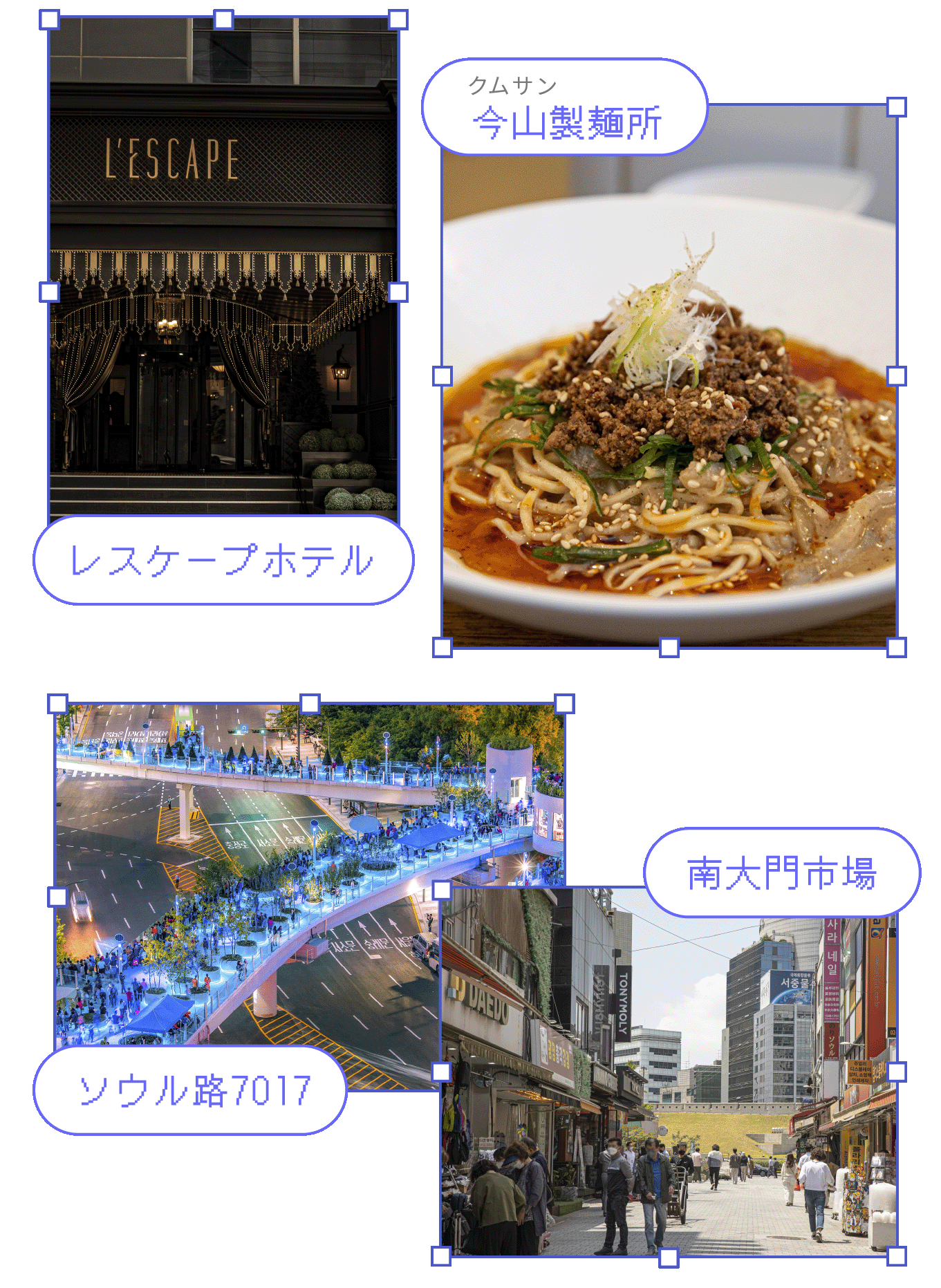 ここ最近は南大門市場にも活気が戻ってきた感じ。もっと新しくて良質な物が増えたことで市場の路地は人々でにぎわい始めて前より色んな世代が南大門を訪れるようになってるの。それに南大門はもちろんその周辺に人気スポットができてきたことも活気を取り戻した理由の一つ。新世界グループが運営する、パリのサロンを連想させるレスケープホテルはロマンチックで、今山(クムサン)製麺所というレストランはミシュランのビブグルマンに選ばれていつも行列ができるお店。ソウル路7017も南大門の近くにあってソウルの夜景が堪能できるビューポイント。市場巡りの他にも楽しみどころ満載!もっと色んなものが見たいあなたにぴったり!