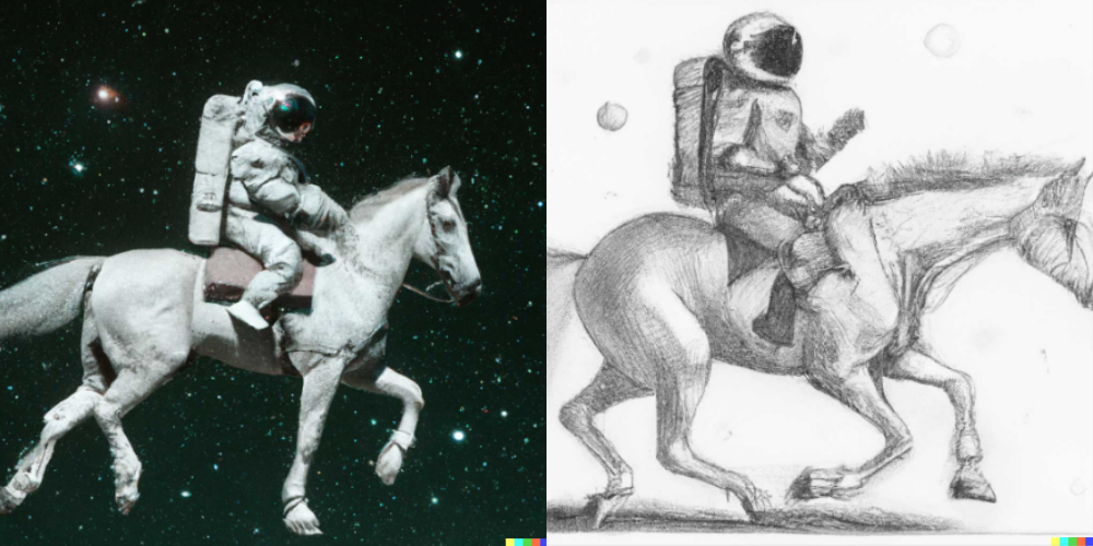 현재의 달리 2는 "우주비행사가 말을 탄 모습을 사실적인 스타일”로 만들어 달라고 하면 위의 왼쪽과 같은 이미지를 출력해줘요. 즉, 문장을 쓰면 사진처럼 정교한 그림을 그려주는 것이죠. 또, '사실적인 스타일'을 '손 그림 스타일'이라는 설명으로 바꾸면 우주비행사가 말 위에 올라탄 같은 모습이 도화지에 연필로 그린 듯한 위의 오른쪽 이미지가 출력되는데요. 이는 현재 '생성 모델(Generative Model)'*을 사용한 시스템 중 달리 2만이 수행할 수 있는 작업이에요.