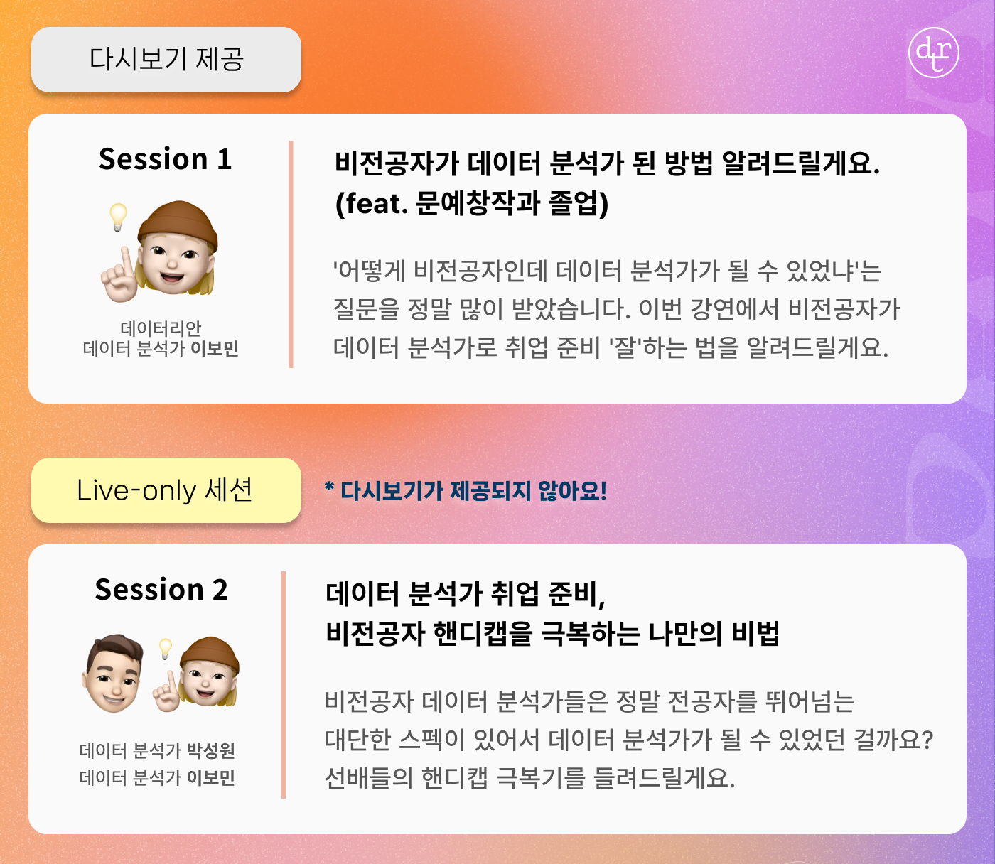 라이브 세미나를 신청한 분께는 1부 강연 다시보기를 제공합니다. 세미나 다음 날 오전에 이메일, 문자로 안내해 드릴게요. 라이브 세미나는 정가 대비 70% 할인된 로그인 전용 특별 할인가, 1만 원에 신청하실 수 있어요. 📍연사 Q&A와 2부 패널토크는 Live-only 세션으로, 다시보기가 제공되지 않아요. Live-only 세션에서는 라이브 참여자들만 들을 수 있는 더 실무적이고 최신 정보에 관해 얘기합니다. 내용이 궁금하다면 세미나 당일, 놓치지 말고 참여해 주세요!