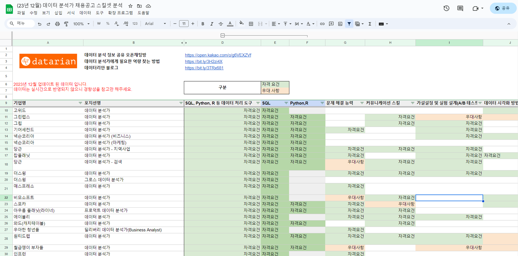 만약 이 과정이 너무 번거롭다면, 데이터리안 웹사이트에 로그인하고 현업 데이터 분석가가 직접 한 땀 한 땀 모은 채용공고 데이터를 참고해 보세요. 📍링크 무단 배포는 금지합니다.