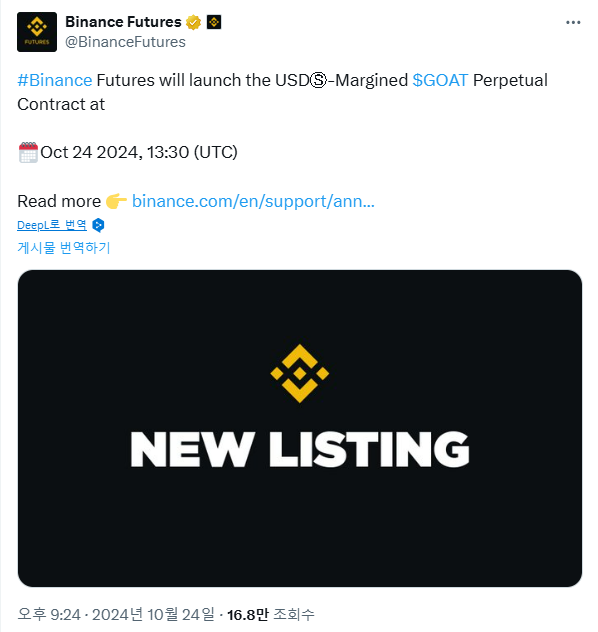 지난 23일, 시가 총액 1조 원을 돌파하고 바이빗(Bybit)에 상장하면서 폭발적인 상승세인 보여준 $GOAT가 바이낸스에도 상장하자 트위터 커뮤니티에서 주목 받고 있음