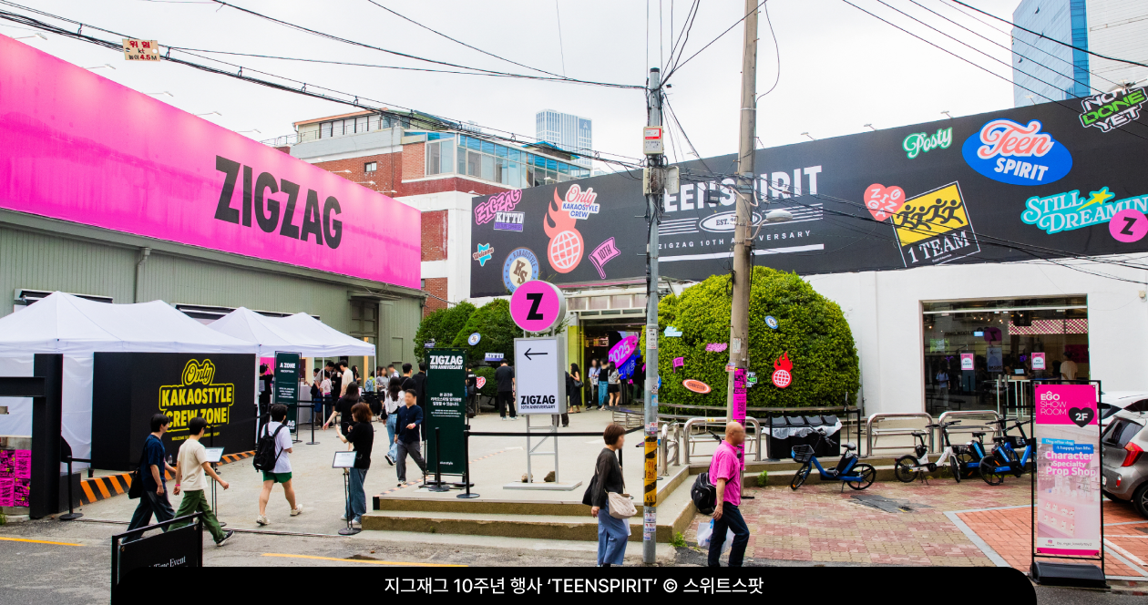 ๋์๊ฐ ํ์ฌ์ ์ด๊ธฐ๋ ์ฑ์๋ ๊ฑฐ๋ฆฌ ์ ์ฒด๋ก ํ์ฅ๋์๋๋ฐ์. ์ผ๋ถ ์ ํด ๋งค์ฅ์์๋ ์ง๊ทธ์ฌ๊ทธ ํ์ ์ธ์ฆ ์ ์ผ๋ฐ ์ ์ ๋ค๋ ์์ง์๊ณผ ๋์ผํ ํํ์ ๋๋ฆด ์ ์๋๋ก ์ค๊ณํ๊ณ , ๊ฑฐ๋ฆฌ ๊ณณ๊ณณ์ ๋ฐฐ์น๋ ์ ์ฉ ํฌ์คํฐ์ ์๋ด๋ฌผ์ ์ฑ์๋ ์ผ๋๋ฅผ ํ๋์ โ์ง๊ทธ์ฌ๊ทธ ํ์คํฐ๋ฒโ์ฒ๋ผ ํ๋ฐ๊ฟ์์ผฐ์ด์. ๊ฒฐ๊ณผ์ ์ผ๋ก ์ง๊ทธ์ฌ๊ทธ๋ ํ๋์ ์บ ํ์ธ์ผ๋ก ๋ด๋ถ ๊ฒฐ์๋ ฅ ๊ฐํ์ ์๋น์ ์ ์ ํ๋๋ผ๋ ๋ ๋ง๋ฆฌ ํ ๋ผ๋ฅผ ๋์์ ์ก์ผ๋ฉฐ, ๋จ์ ์ฌ๋ด ์ด๋ฒคํธ๋ฅผ ๋์ด ๋ธ๋๋ ์ ์ฒด์ฑ์ ์จ ๊ฑฐ๋ฆฌ๋ก ํ์ฐ์ํจ ๋