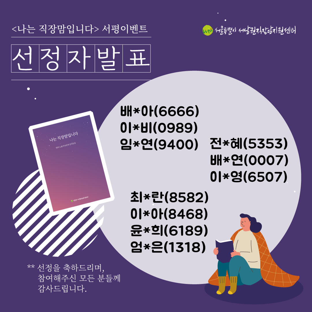 우리 센터가 제작한 인터뷰집 <나는 직장맘입니다> 서평 이벤트의 선정자를 발표합니다🎤