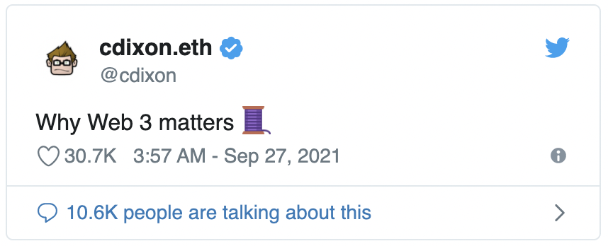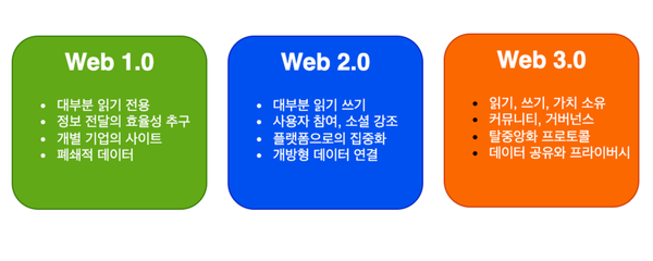 출처 : 정우현 아톰릭스랩 대표 1990년대에서 2000년대 초의 초창기 웹이 웹 1.0이라고 할 수 있어요. 이때의 인터넷은 기업이나 개인들이 정적인 페이지를 기반으로 정보를 제공하고, 사용자들은 이러한 정보를 읽는 일방적인 생태계였습니다. 업데이트도 간헐적이었고 인터랙션 역시 찾아볼 수 없었죠. 그리고 2000년대 초부터 현재까지의 웹 2.0(이하 웹2)이 등장합니다. 이전에는 수동적으로 데이터를 소비하는 것만이 가능했다면 이제 쓰기도 가능해지면서 사용자들이 적극적으로 참여하게 되었어요. 일부 기업들이 플랫폼을 개설하면 그 안의 사용자들이 자신이 직접 콘텐츠를 만드는 식입니다. 쌍방향으로 소통하는 것도 가능해졌습니다. 기존에는 텍스트만을 주로 다루었다면 빠른 속도로 고용량 파일과 동영상을 공유할 수 있었고요. 그러나 플랫폼 성장에 기여한 사용자들은 오히려 그 이용의 대가로 개인정보를 제공해야 했고, 보상은 거의 받지 못했습니다. GAFA와 같은 소수의 회사가 사용자의 콘텐츠와 프라이버시를 활용해 얻은 이익을 독식했고, 웹은 더욱더 중앙화 및 독점화되고 통제되는 결과를 낳았습니다. 특히, VC 앤드리슨 호로위츠의 암호화폐 펀드를 총괄하는 제너럴 파트너 크리스 딕슨은 그의 트위터에서 현재 웹2의 문제점을 이렇게 지적했습니다. “(플랫폼이 어느 정도 궤도에 오르면) 사용자들과의 관계가 ”positive-sum”에서 제로섬으로 바뀝니다. 계속해서 성장하려면 (플랫폼은) 사용자로부터 데이터를 추출하게 되고, 한때 파트너였던 회사들과 경쟁해야 합니다. 잘 알려진 예시로는 마이크로소프트 vs. 넷스케이프, 구글 vs. 옐프, 페이스북 vs. 징가, 트위터 vs. 서드파티 클라이언트, 그리고 에픽 vs. 애플이 있습니다.” 즉, 플랫폼 위에서 협력하면서 콘텐츠를 쌓아왔던 파트너들이 어느 순간부터는 플랫폼과 경쟁하게 되고, 결국 혁신의 속도가 줄어들 수밖에 없다는 이야기입니다. 웹3은 이러한 상황에 대한 문제 제기에서 출발합니다. 어떻게 하면 특정 기업이 인터넷을 지배하지 않도록 견제하고, 탈중앙화되고 분권화된 네트워크로 돌아갈 수 있을까요? 블록체인을 기반으로 데이터를 분산시키고, 데이터의 소유권도 플랫폼이 아니라 개인이 갖도록 하면 됩니다. 즉, 웹2의 ‘읽기’, ‘쓰기’에 ‘소유’가 추가되는 것이죠. 어떤 소수가 운영하는 것이 아니라 그 플랫폼 내의 커뮤니티가 규칙을 정하고, 발전시키도록 하는 거예요. 그렇게 해서 콘텐츠를 만들어 플랫폼 성장에 기여한 사용자들에게 경제적 이익과 지배권을 돌려줄 수 있도록 만들면 됩니다. 이것이 현재의 웹3이 지향하고자 하는 방향이라고 볼 수 있습니다. 크리스 딕슨의 트윗을 참고해 좀 더 구체적으로 이야기해볼까요? 사용자는 NFT나 대체 가능한 토큰을 통해 플랫폼의 일부를 소유할 수 있습니다. NFT로는 예술작품, 사진, 코드, 음악, 텍스트와 같은 다양한 오브젝트를 소유하고, 수익을 창출할 수도 있습니다. 이렇게 토큰을 활용하면 사용자가 네트워크의 성장과 토큰의 가치 향상이라는 공동의 목표를 위해 협동할 수 있게 되는 것입니다. 그렇기 때문에 웹3에서는 커뮤니티가 중요한 키워드로 등장합니다. 혹자는 웹3을 여러 기술적 요소와 더불어 ‘커뮤니티’를 기반으로 하는 사회적 운동으로 해석해야 한다고 이야기하기도 합니다. 이렇게 설명하긴 했지만... 사실 굉장히 추상적이고 모호해서 갈 길이 멀기도 합니다. 일각에서는 웹3가 이미 수년 전부터 언급되던 기술을 리브랜딩한 것에 불과하며, 최근 암호화폐의 인기와 맞물려서 관심이 쏠린 것 같다는 분석하기도 합니다. 그럼에도 이전까지는 웹2에서의 문제들에 대해 아예 기술적으로 도전 자체가 불가능했다면, 요즘에는 블록체인 기술 등으로 구현 자체는 가능해졌다고 해요.