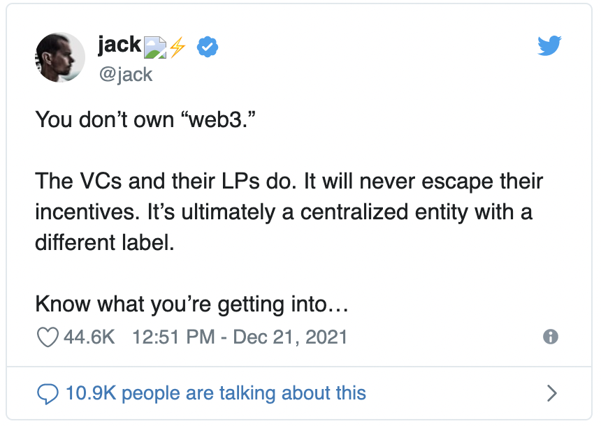 지금까지는 아주 장밋빛으로 가득한 웹3, 대체 그럼 잭 도시와 위에서 이야기한 딕슨이 소속된 앤드리슨 호로위츠는 왜 싸운 걸까요? 먼저, VC 앤드리슨 호로위츠(a16z)는 페이스북부터 에어비앤비, 클럽하우스, 로블록스와 같은 회사들에 성공적으로 투자한 경력이 있습니다. 최근에는 웹3의 시대가 곧 온다는 전망을 하면서 관련한 회사들에 펀드 자금 대부분을 투자하고 있다고 합니다. 특히, 앤드리슨 호로위츠는 웹3가 거대 기업을 견제할 수 있다는 점에서 매우 호의적인 입장이에요. 앤드리슨 호로위츠의 공동 설립자인 마크 앤드리슨이 이전에 설립했던 넷스케이프가 마이크로소프트와의 웹 브라우저 전쟁에서 패배한 전적이 있기 때문이기도 합니다. 마이크로소프트가 인터넷 익스플로러를 윈도우 OS에 포함해 무료로 배포했었거든요. 그렇기 때문에 소수의 세력이 소유할 수 없는 웹3의 시대가 도래해야 한다고 보는 것이죠. 그런데 이런 그의 생각에 반기를 드는 사람들이 나타납니다. 잭 도시가 그중 한 명이에요. 사실 도시는 “내 인생에 이보다 더 중요한 일은 없다”고 했을 정도로 암호화폐와 블록체인의 아주 열렬한 옹호자입니다. 지난 해 트위터 CEO에서 사임한 다음 날, CEO로 있던 핀테크 회사 스퀘어의 사명을 블록체인의 ‘블록’으로 변경하고, 암호화폐 사업에 전념하겠다고 발표하기도 했고요. 그런 그임에도 웹3에 대해서는 “웹3를 통해 이득보는 건 VC와 VC에 투자하는 투자자(LP)들뿐이다”라며, “페이스북 초기 후원자 겸 웹 3.0 지지자인 앤드리슨 호로위츠 등에 의해 웹 3.0이 지배될 것이다”라고 강력하게 비판했어요. 왜 그는 이렇게 회의적일까요? 위에서도 말했지만, 웹3의 개념은 매우 모호하고 아직 갈 길이 멀어요. 그런데도 앤드리슨 호로위츠와 크립토 쪽 사람들은 계속해서 웹3를 언급하면서 이목을 집중시키고 동시에 막대한 규모의 자금을 투자하고 있죠. 벤처투자 통계를 내는 기관 피치북에 따르면 2021년 3분기까지 블록체인 분야에 214억 달러가 투자되었는데 그중 약 40%를 앤드리슨 호로위츠에서 집행했다고 해요. 또 최근 22억 달러 규모의 블록체인 전용 펀드를 조성하기도 했고요. 어쩌면 앤드리슨 호로위츠와 같은 투자자들은 사람들의 이목을 집중시키고 가치를 올리는 것이 실제 웹3가 구현되는 것보다 더 중요할 수도 있다고 볼 수도 있는 것이죠.