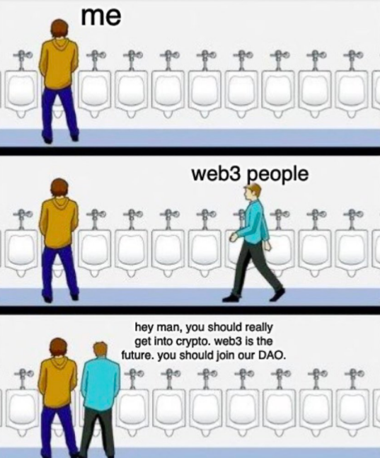 일론 머스크 역시 웹3는 허상에 불과하다며 이런 밈을 올리기도 했어요. (출처 : 트위터) 저스틴 테일러 트위터 마케팅 수석도 비슷한 우려를 드러냈습니다. 최근에는 많은 사람이 코인베이스에서 이더리움을 구매하고 가상지갑인 메타마스크로 전송한 후, NFT를 오픈씨에서 거래하는데, 이렇게 사람들이 암호화폐와 NFT를 거래하면서 사용하는 기업이 소수에 불과하고, 이 기업들이 결국 안데르센 호로위츠와 같은 VC에 의해 주도되고 있다는 것이죠. 위에서 언급한 도시와 테일러는 웹3이 개인들이 중심이 돼야 더 나은 생태계가 될 수 있을 것이라는 입장이라면 일론 머스크는 아예 웹3에 대해서 회의적인 입장입니다. 머스크는 플랫폼의 성장이 다수의 (관심 없는) 대중들에 의해 가능할 리 없다는 생각이에요. 소수의 똑똑한 사람들이 해도 어려운데 주체가 없는 분산화된 프로젝트가 과연 제대로 추진될 수 있겠냐는 것이죠.