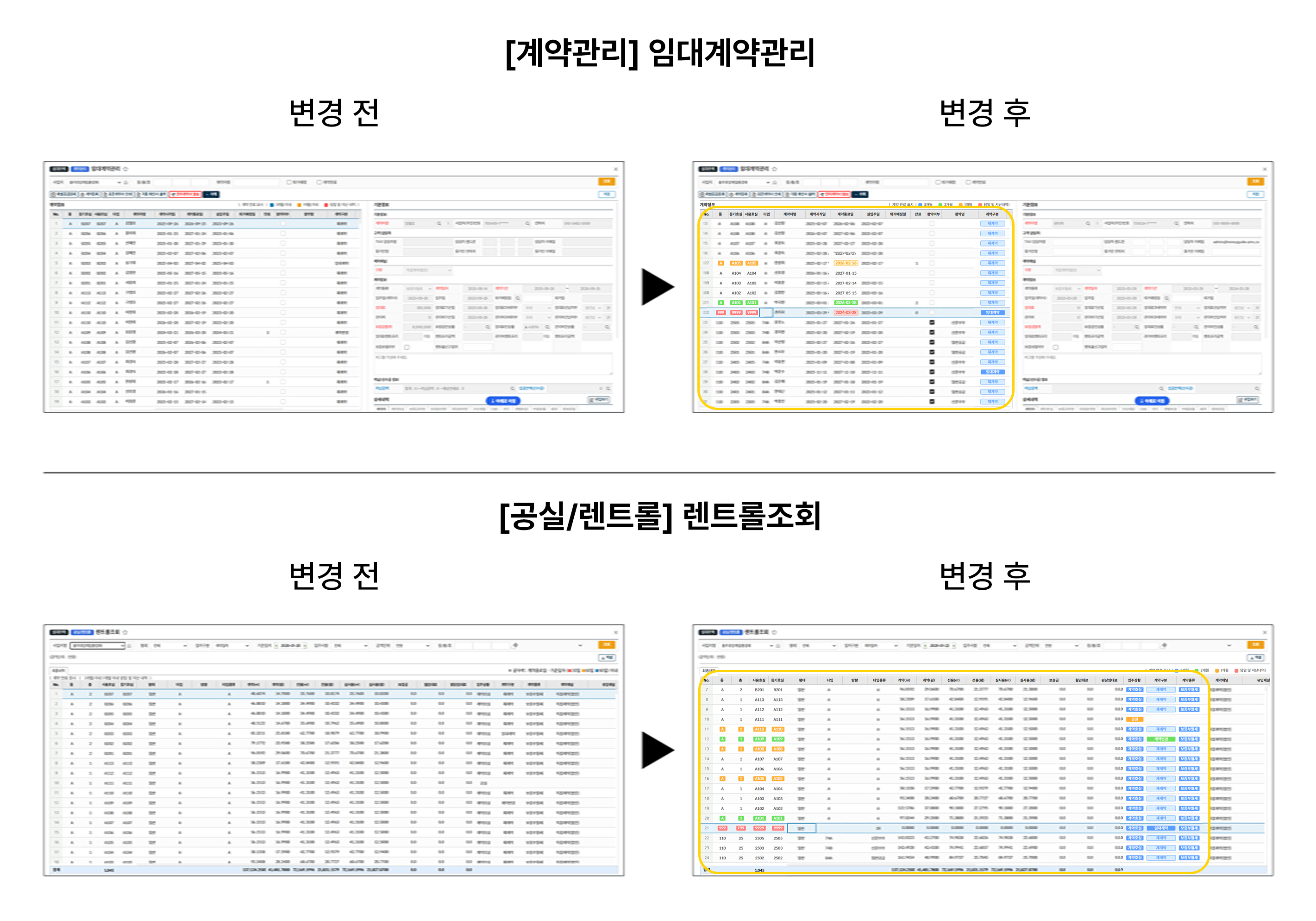 [임대계약관리, 렌트롤조회]를 비롯하여 많은 메뉴의 UI/UX를 고도화했습니다.
