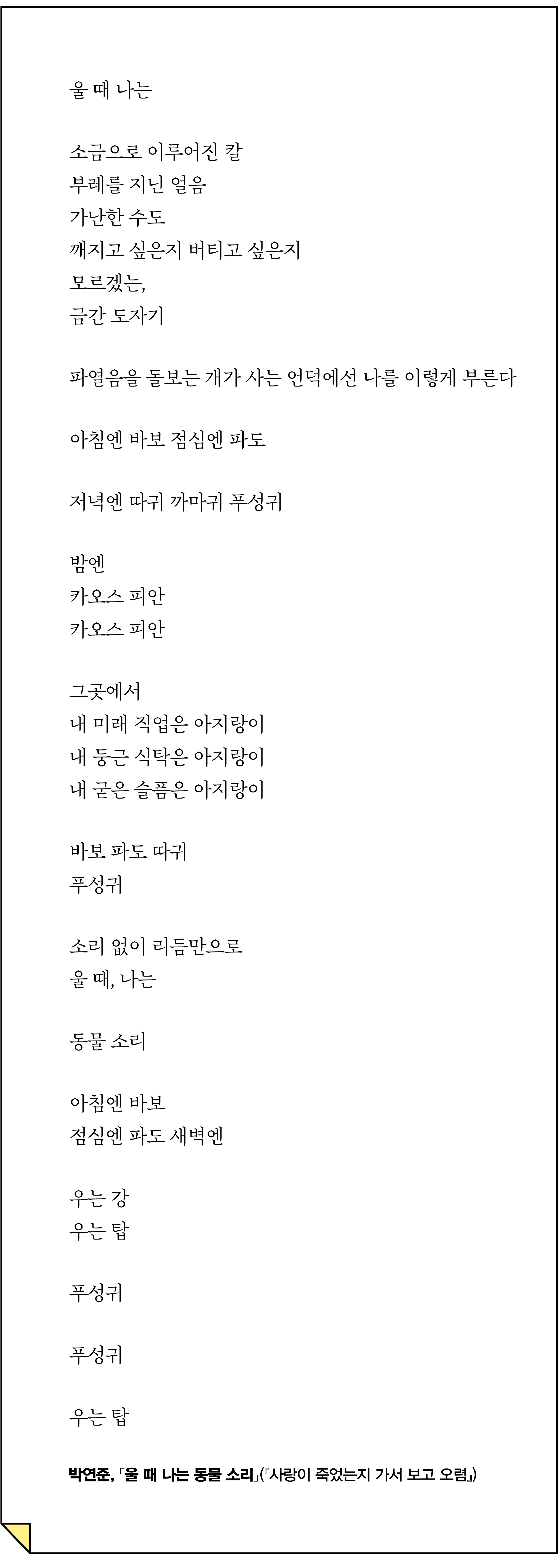 “울 때 나는” “칼”이고, “얼음”이고, “수도”이며, “금간 도자기”였는데. “파열음을 돌보는 개가 사는 언덕에선” “아침엔 바보 점심엔 파도// 저녁엔 따귀 까마귀 푸성귀”로 불려요. 내가 울고 있다는 사실은 변함이 없는데, 시가 가진 리듬 속에서 “나”는 감각적으로 더 멀리, 넓게 뻗어나가지요. 이제는 바보, 파도, 따귀, 푸성귀라고 말하는데도 울고 있는 사람이 떠올라요. “소리 없이 리듬만으로” 울고 있는 사람이요. 언어의 흐름이 우리를 이성적 규칙이 아닌, 전혀 다른 방식으로 연결해요. 시가 가진 커다란 매력이죠. 시를 계속 읽게 되는 이유이기도 하고요. 시가 우리를 고정된 관념이나 관습, 이해의 틀에서 해방시키니까요.