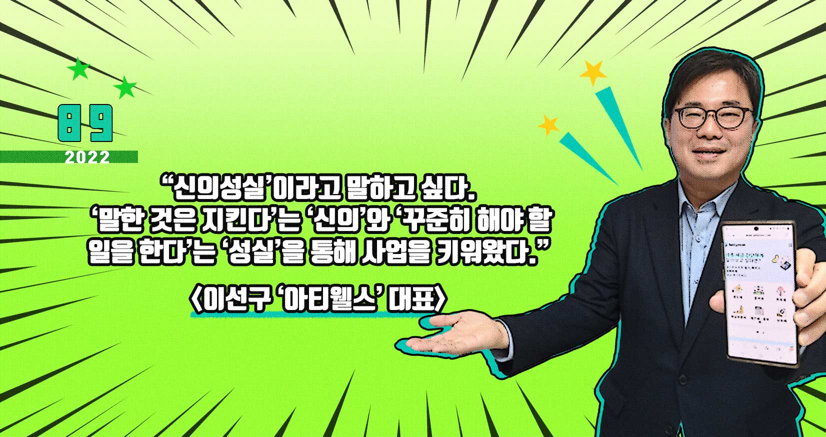 [라이프점프 뉴스레터 커버 스토리] “‘신의성실’은 나의 인생관이기도 하다. 지금도 매일 오전 5시에 일어나 7시 30분까지 회사로 출근하고 있다. 프로그램 개발이 특정 지점에서 막힐 때마다, 사업이 난관에 부딪힐 때마다 이를 해결할 수 있는 인재가 나타나 문제가 해결됐다. 그게 다 내가 지금까지 지켜온 ‘신의’ 덕분이 아닌가 한다.” - 이선구 '아티웰스' 대표