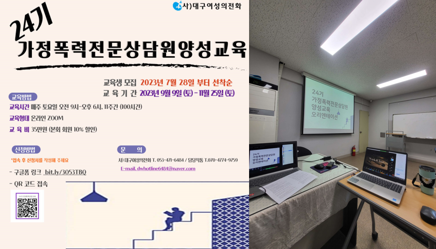 - 내 용 : 24기 가정폭력전문상담원 양성교육이 9월 9일에 개강했습니다. 2023년 가정폭력전문상담원 교육과정이 온라인으로 모집될 수 있는 최대 인원인 70명을 모집하였습니다.