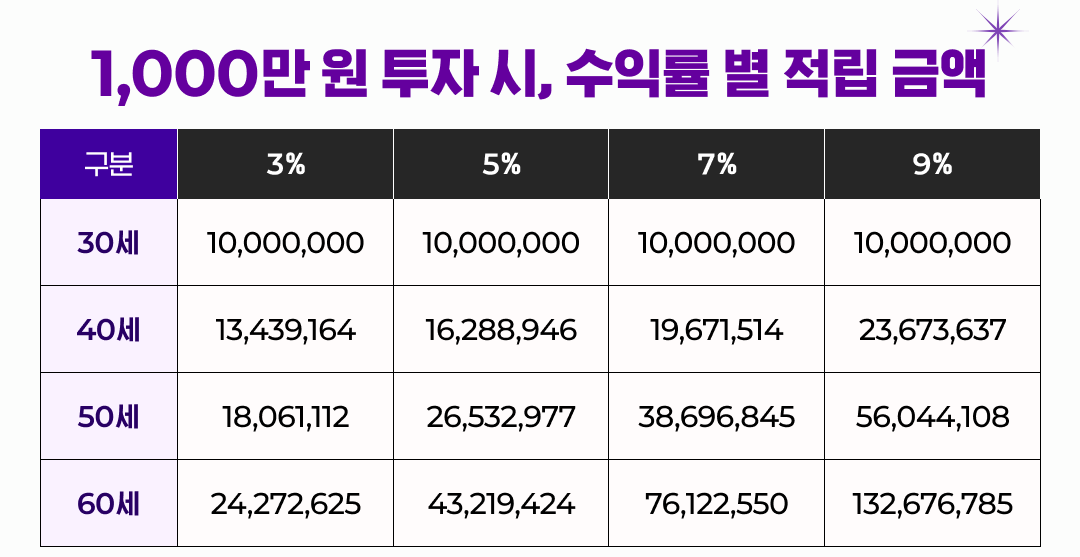 ๋์ ํฌ์๋ฅผ ํ๋ค๊ณ ๊ฐ์ ํด ๋ณผ๊ฒ. ๋ง์ฝ ์ฐ 5%์ ์์ต๋ฅ ์ด๋ผ๋ฉด, 60์ธ ์์ ์ ์ฝ 4,322๋ง ์์ ์ ๋ฆฝํ ์ ์์ด. ๋ฌผ๊ฐ์์น๋ฅ 2%๋ฅผ ๋ฐ์ํ๋๋ผ๋ ํ์ฌ ๊ฐ์น ๊ธฐ์ค์ผ๋ก ์ฝ 2,386๋ง ์์ ํด๋นํ๋ ๊ธ์ก์ด์ง. ์ ๊น์ ์ฆ๊ฑฐ์์ ์ฐธ์ผ๋ฉด 60์ธ ์์ ์ 1๋